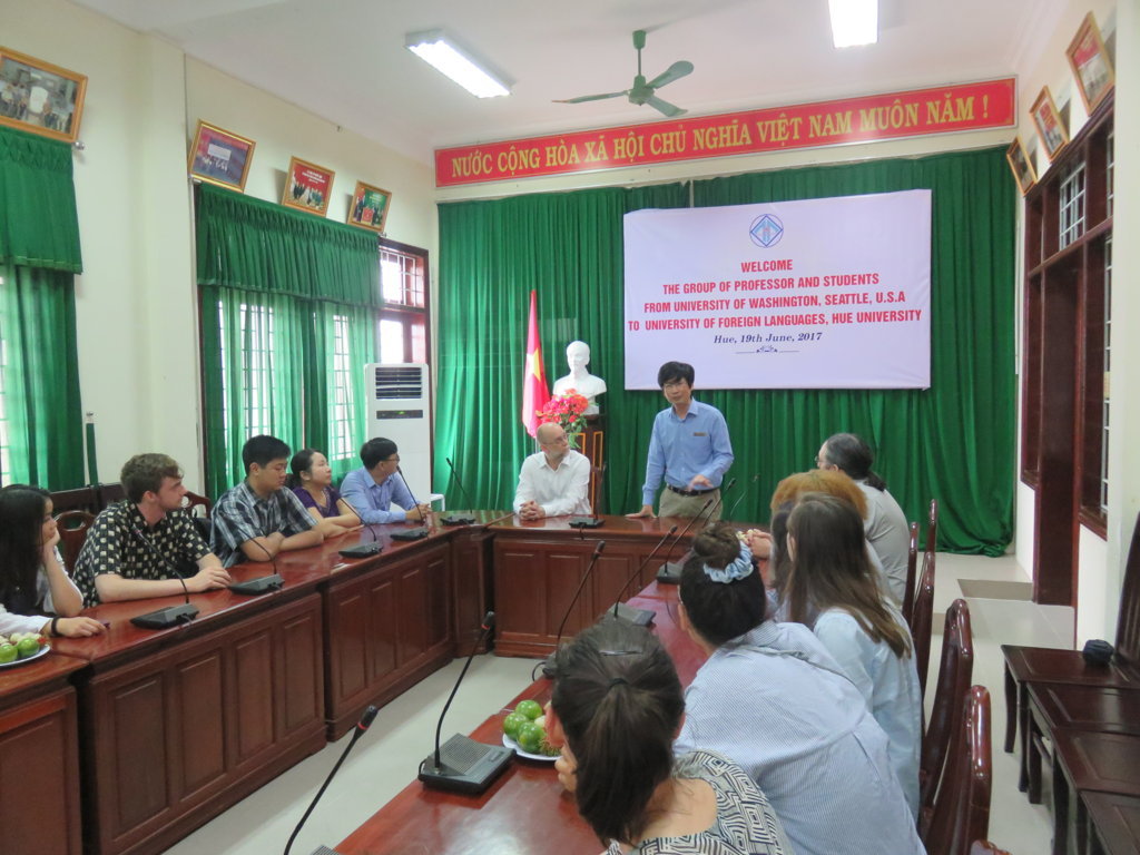 Welcoming the delegation, on behalf of the university were Dr. Bao Kham - Rector, Dr. Le Lam Thi - Deputy Dean of Faculty of Vietnamese Studies, representatives of Office for Science, Technology and International Cooperation. Dr. Bao Kham was happy to welcome the delegation to study Vietnamese history and culture, and hopefully in the coming years, other student groups from University of Washington will study at the University during summer holidays. This year, students from University of Washington will study at University of Foreign Languages, Hue University and visit some historical sites in Hue City, Quang Tri and Hoi An from June 19, 2017 to July 17, 2017. On behalf of University of Washington, Prof. Giebel Christoph Johannes Friedrich thanked the university for giving his students the opportunity to study and visit sites of Vietnamese history and culture and offered courses for the next years.