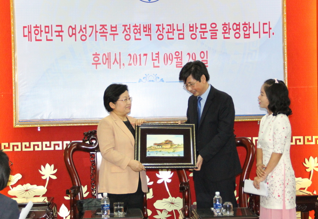 On the afternoon of September 29th, 2017, Dr. Bao Kham, Rector of University of Foreign Languages, Hue University held a meeting with Ms Chung Hyun Back, Korean Minister of Gender Equality and Family. Korean volunteer teachers, teachers of Korean Language & Culture Faculty, heads of the university functional offices welcomed the delegation.