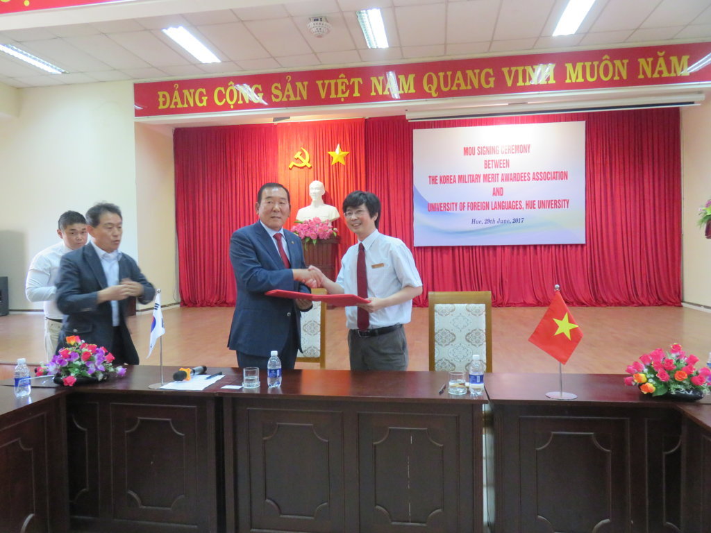 The signing ceremony of educational cooperation on awarding scholarships to students of University of Foreign Languages, Hue University with the Korea Military Merit Awardees Association 2017-07-05