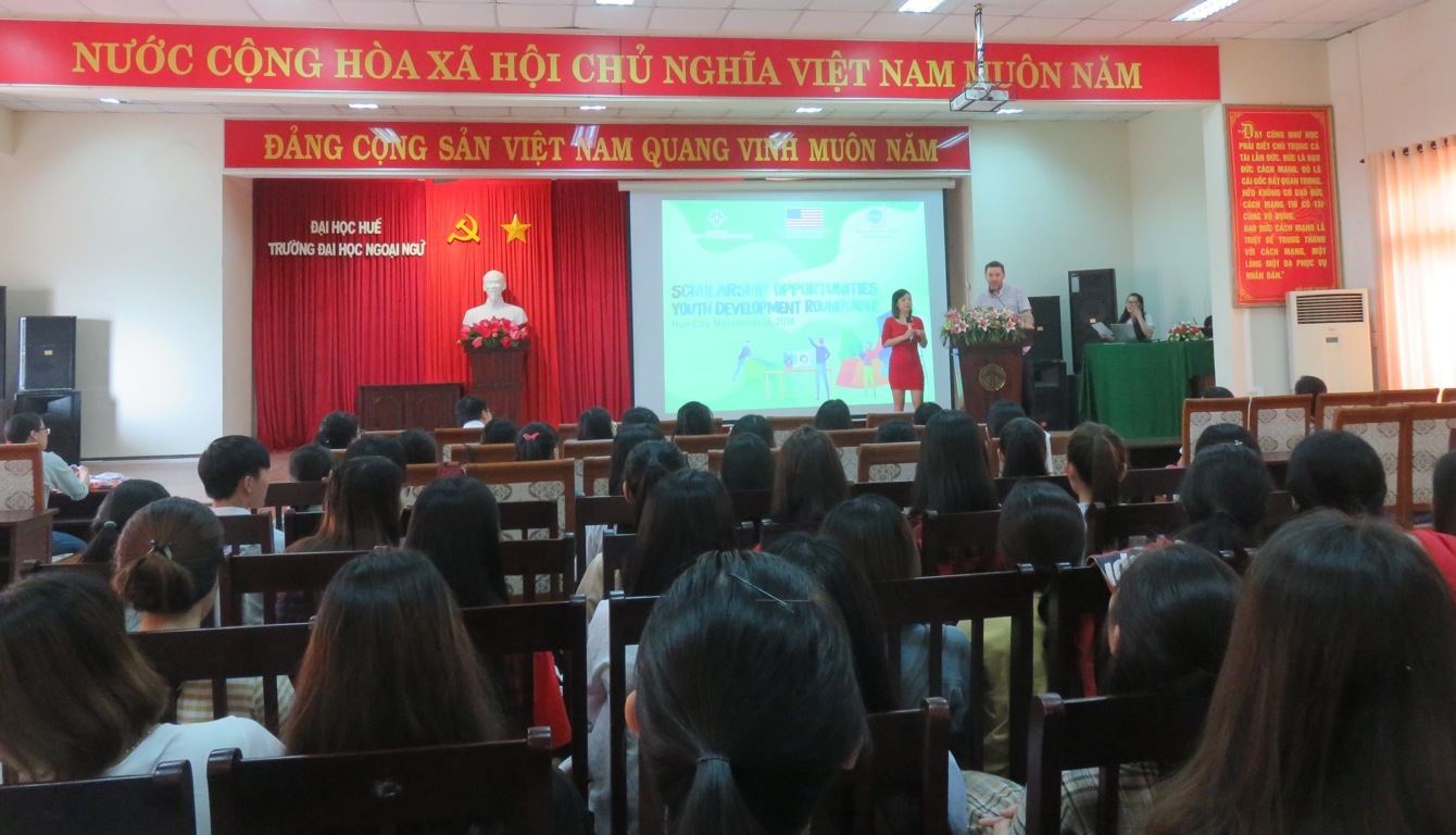 Sáng ngày 16/ 11/ 2018 Trường Đại học Ngoại ngữ, Đại học Huế phối hợp với Tổng lãnh sự quán Hoa Kỳ tại Tp. Hồ Chí Minh tổ chức buổi chia sẽ thông tin về chương trình học bổng của chính phủ Hoa Kỳ.