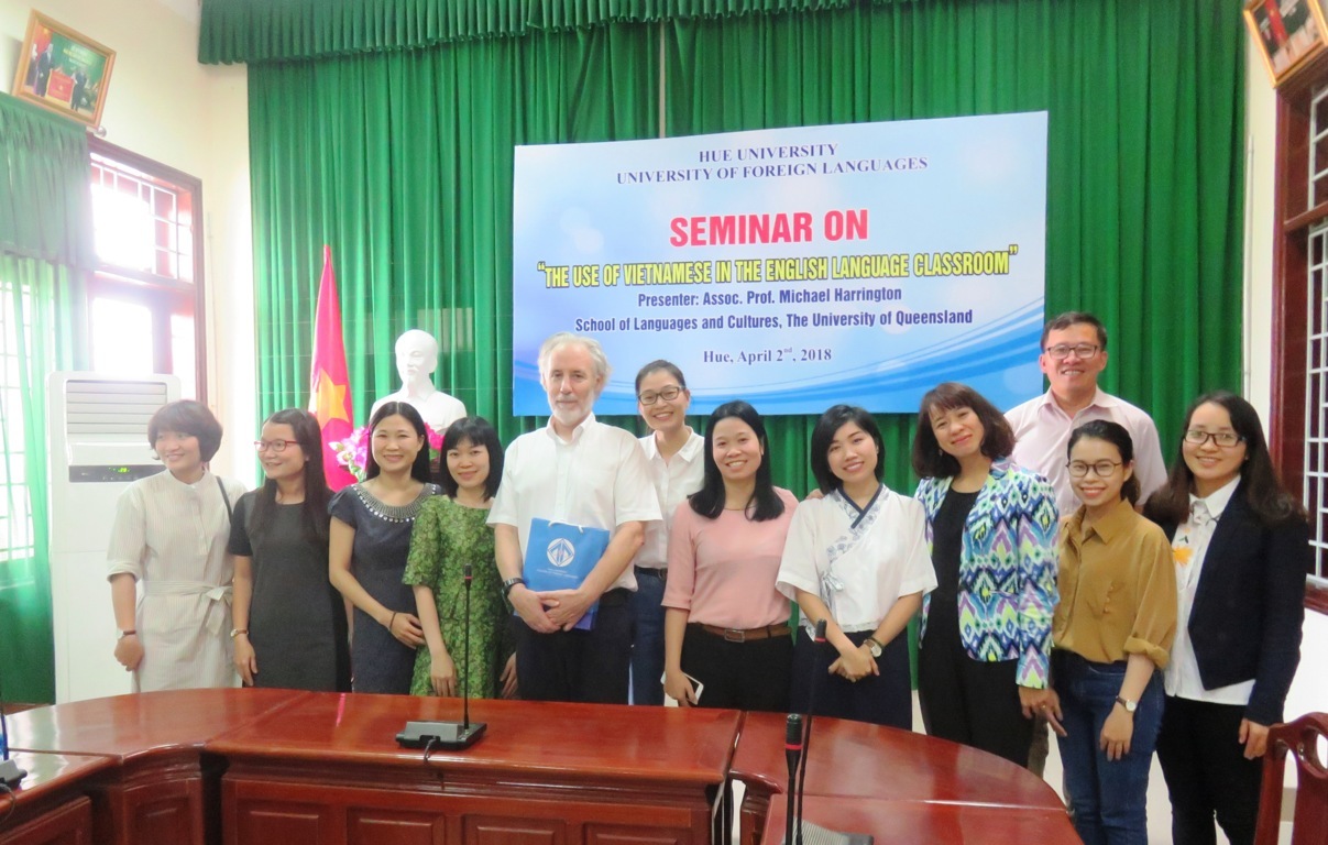 Vào sáng ngày 2/4/2018, Trường Đại học Ngoại ngữ, Đại học Huế đã tổ chức thành công buổi seminar chuyên đề về Giảng dạy tiếng Anh do PGS Michael Harrington đến từ Trường Đại học Queensland chủ trì. Tham gia buổi nói chuyện là hơn 50 giáo viên giảng dạy tiếng Anh từ các Khoa và học viên cao học ngành Phương pháp giảng dạy tiếng Anh của Trường.