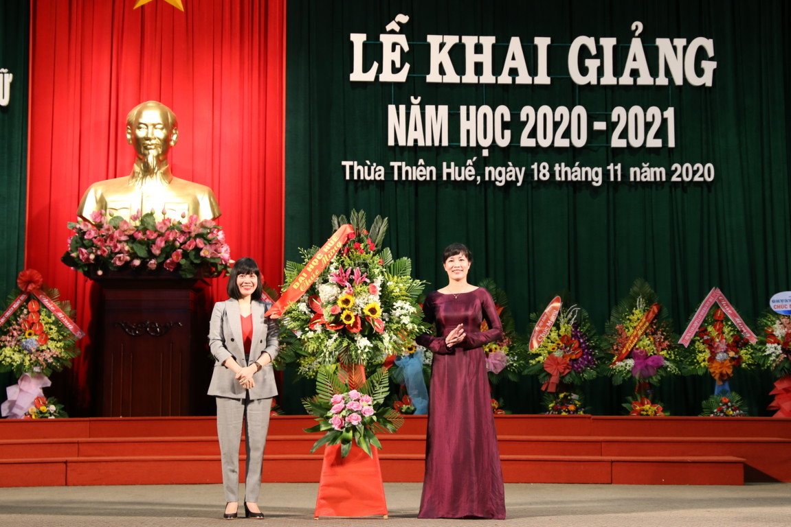 TS. Đỗ Thị Xuân Dung, Phó Giám đốc Đại học Huế phát biểu và tặng hoa chúc mừng khai giảng năm học