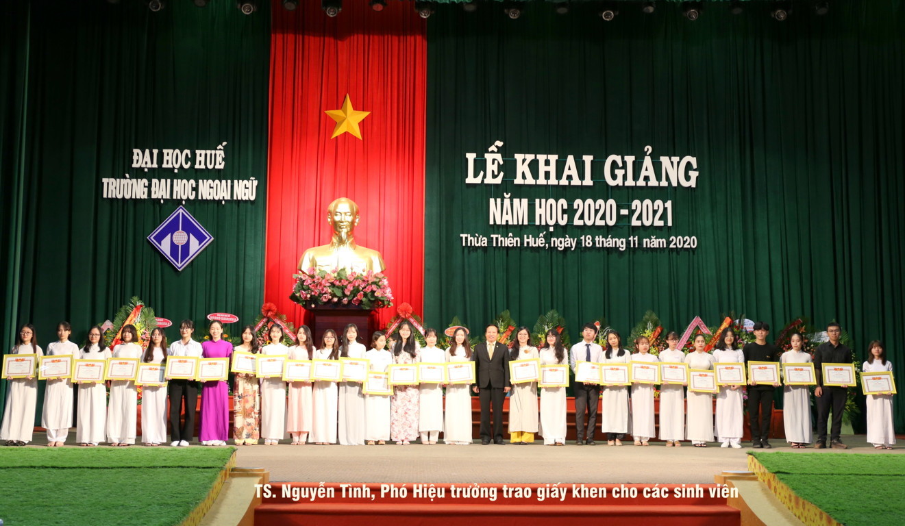 HUFL-Ngày (18/11) Trường Đại học Ngoại ngữ, Đại học Huế đã trang trọng tổ chức Lễ Khai giảng năm học 2020 – 2021 và chào đón tân sinh viênđến dự lễ : Ông Nguyễn Thanh Bình, Phó Chủ tịch UBND tỉnh và đại diện lãnh đạo các cơ quan ban ngành tỉnh Thừa Thiên Huế, lãnh đạo các đơn vị đối tác; về phía Đại học Huế có TS. Đỗ Thị Xuân Dung, Phó Giám đốc Đại học Huế và đại diện lãnh đạo các ban, trường, khoa, trung tâm thuộc Đại học Huế; về phía Nhà trường  PGS.TS Phạm Thị Hồng Nhung, Bí thư Đảng ủy, Hiệu trưởng, quý thầy cô nguyên lãnh đạo Trường cùng đại diện lãnh đạo các đơn vị và viên chức và đặc biệt có sự hiện diện của hơn 600 sinh viên đại diện cho gần  6.000 học viên, sinh viên Nhà trường.