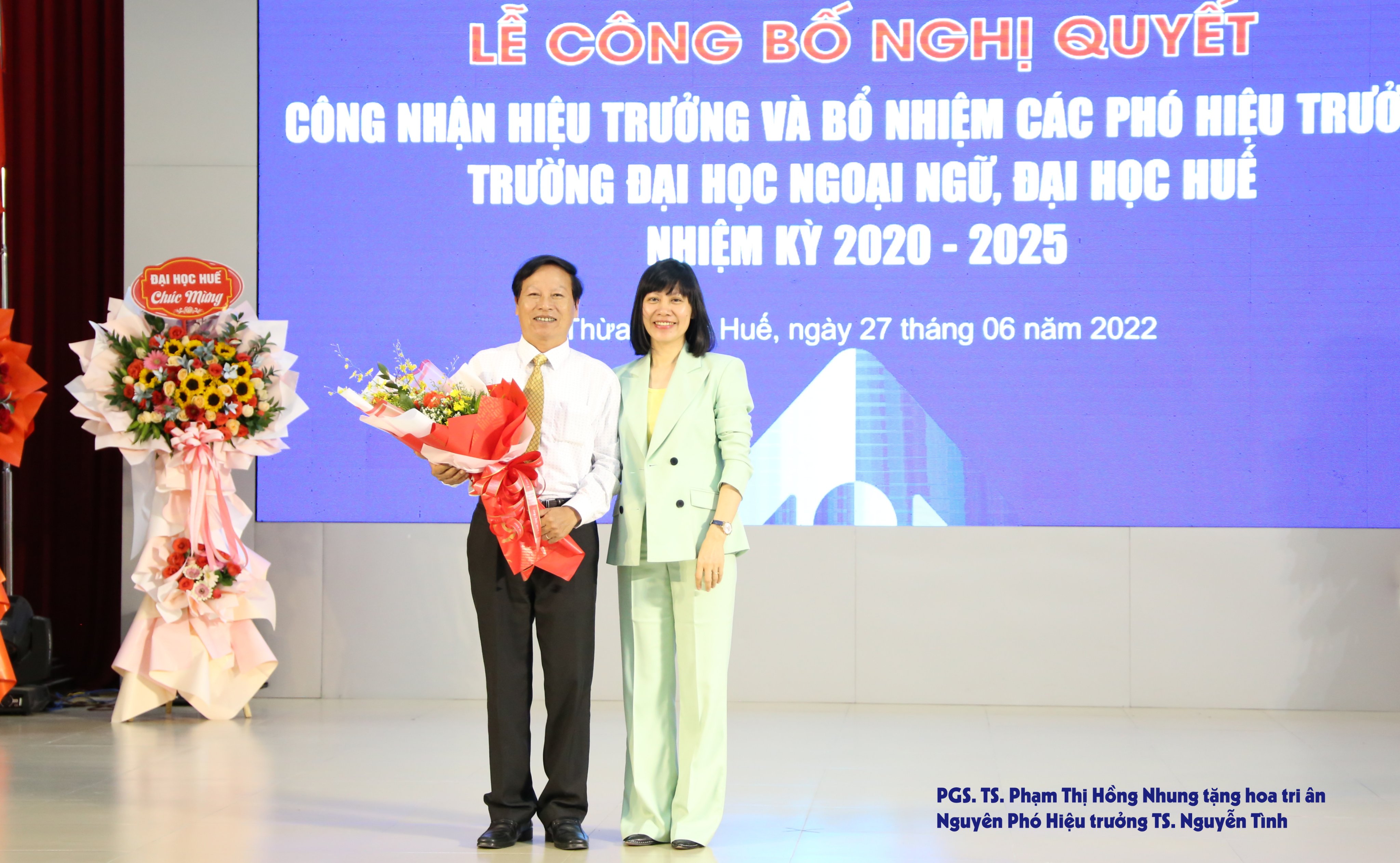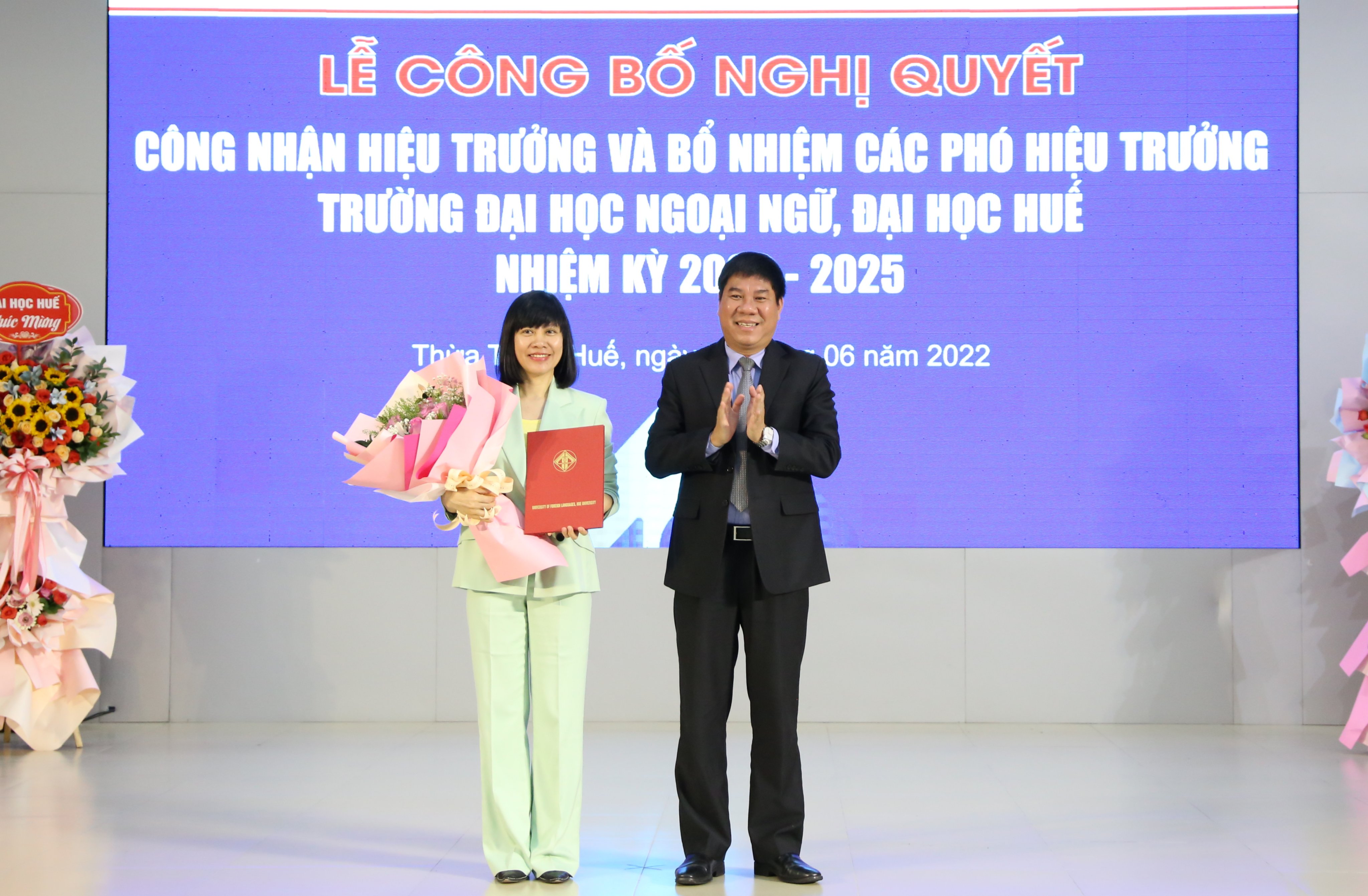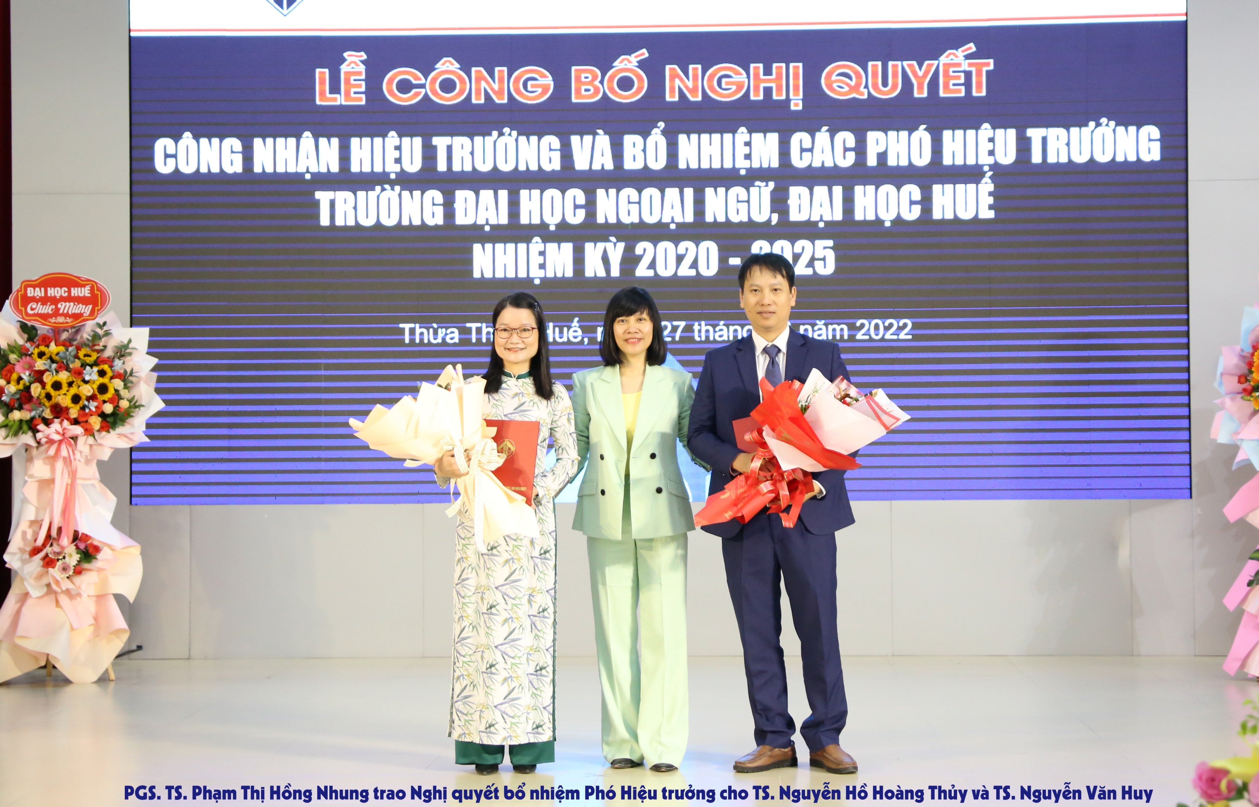 Nghị quyết số 665/NQ-HĐT ngày 23 tháng 06 năm 2022 của Hội đồng Trường Trường Đại học Ngoại ngữ, Đại học Huế về việc bổ nhiệm bà Nguyễn Hồ Hoàng Thủy, Tiến sĩ, Giảng viên chính, Phó Hiệu trưởng Trường Đại học Ngoại ngữ nhiệm kỳ 2019 – 2024, giữ chức vụ Phó Hiệu trưởng Trường Đại học Ngoại ngữ, Đại học Huế nhiệm kỳ 2020-2025. Nghị quyết số 666/NQ-HĐT ngày 23 tháng 06 năm 2022 của Hội đồng Trường Trường Đại học Ngoại ngữ, Đại học Huế về việc bổ nhiệm ông Nguyễn Văn Huy, Tiến sĩ, Giảng viên, Trưởng phòng Đào tạo Trường Đại học Ngoại ngữ, Đại học Huế giữ chức vụ Phó Hiệu trưởng Trường Đại học Ngoại ngữ, Đại học Huế nhiệm kỳ 2020-2025.