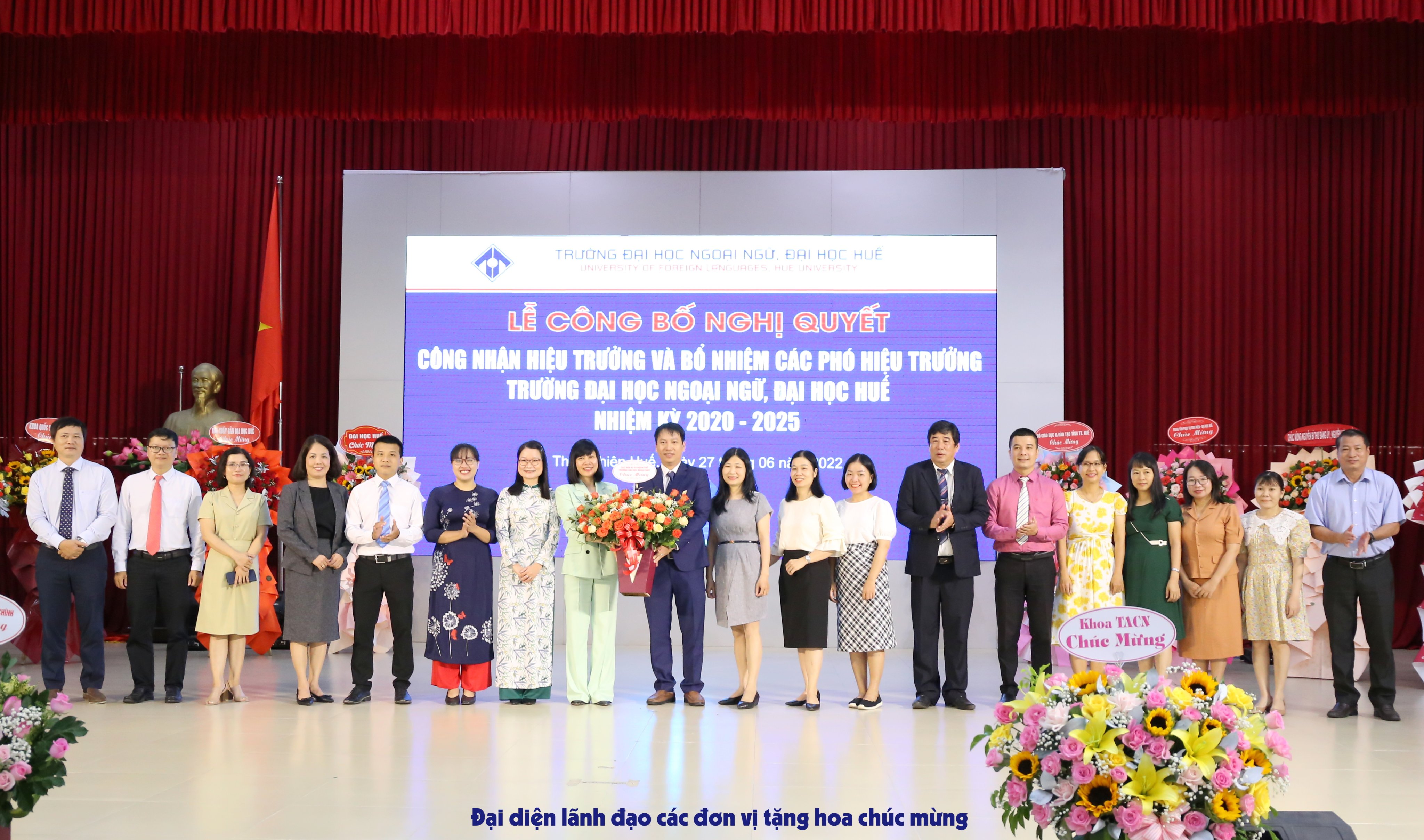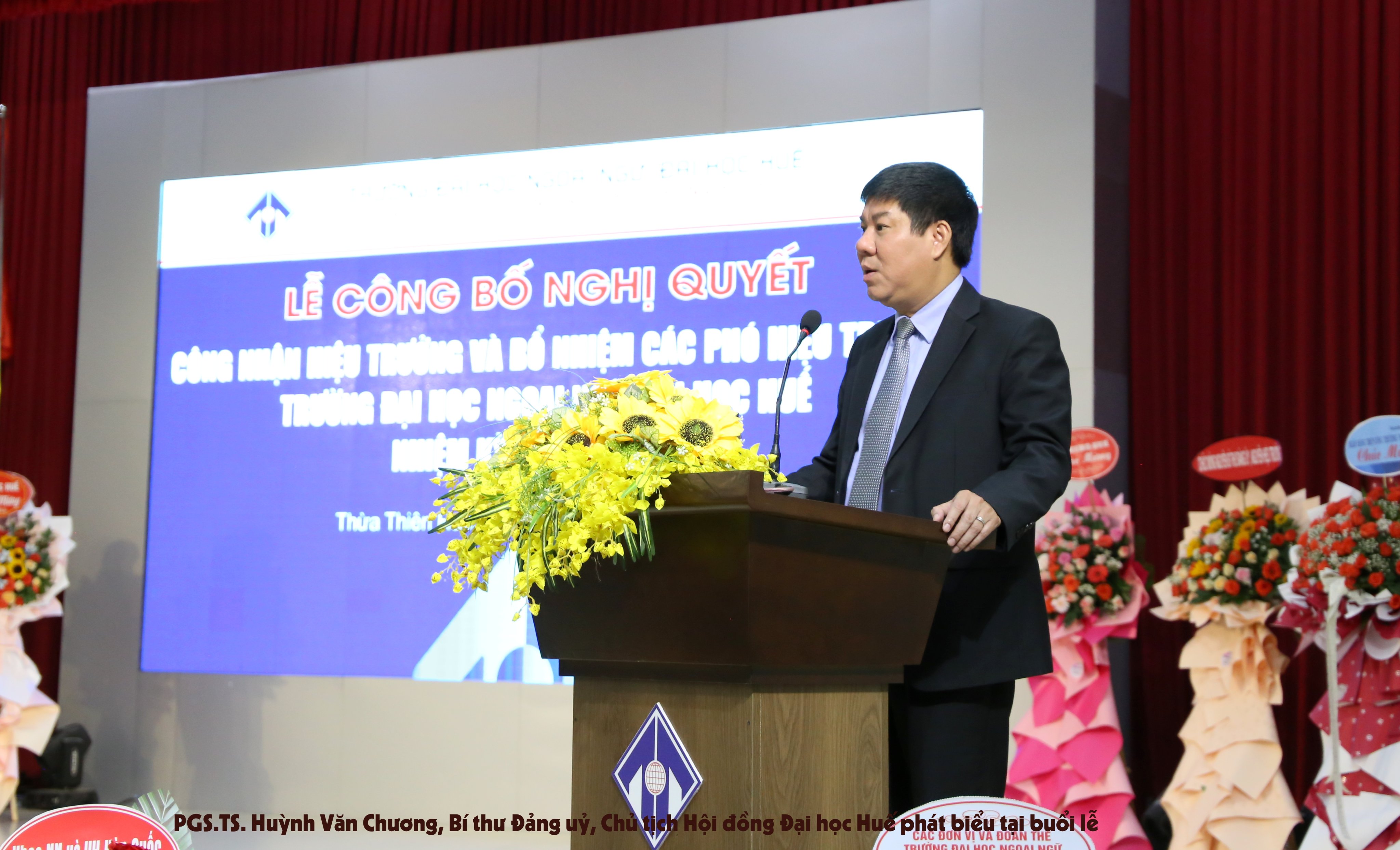 Phát biểu tại buổi lễ PGS.TS. Huỳnh Văn Chương, Bí thư Đảng uỷ, Chủ tịch Hội đồng Đại học Huế đã chúc mừng Hiệu trưởng và các Phó Hiệu trưởng, nghi nhận và đã đánh giá cao vai trò, vị trí của Trường Đại học Ngoại ngữ trong việc góp phần phát triển chung của Đại học Huế. Việc công nhận Hiệu trưởng và bổ nhiệm các Phó Hiệu trưởng lần này là thực hiện đúng chủ trương của Đảng, theo quy định tại Luật số 34/2018/QH14 về sửa đổi, bổ sung một số điều Luật giáo dục đại học và Nghị định số 99/2019/NĐ-CP, ngày 30/12/2019 của Chính phủ, các kết luận của Ban Thường vụ Đảng ủy Đại học Huế và các nghị quyết của Đảng ủy, Hội đồng Đại học Huế.