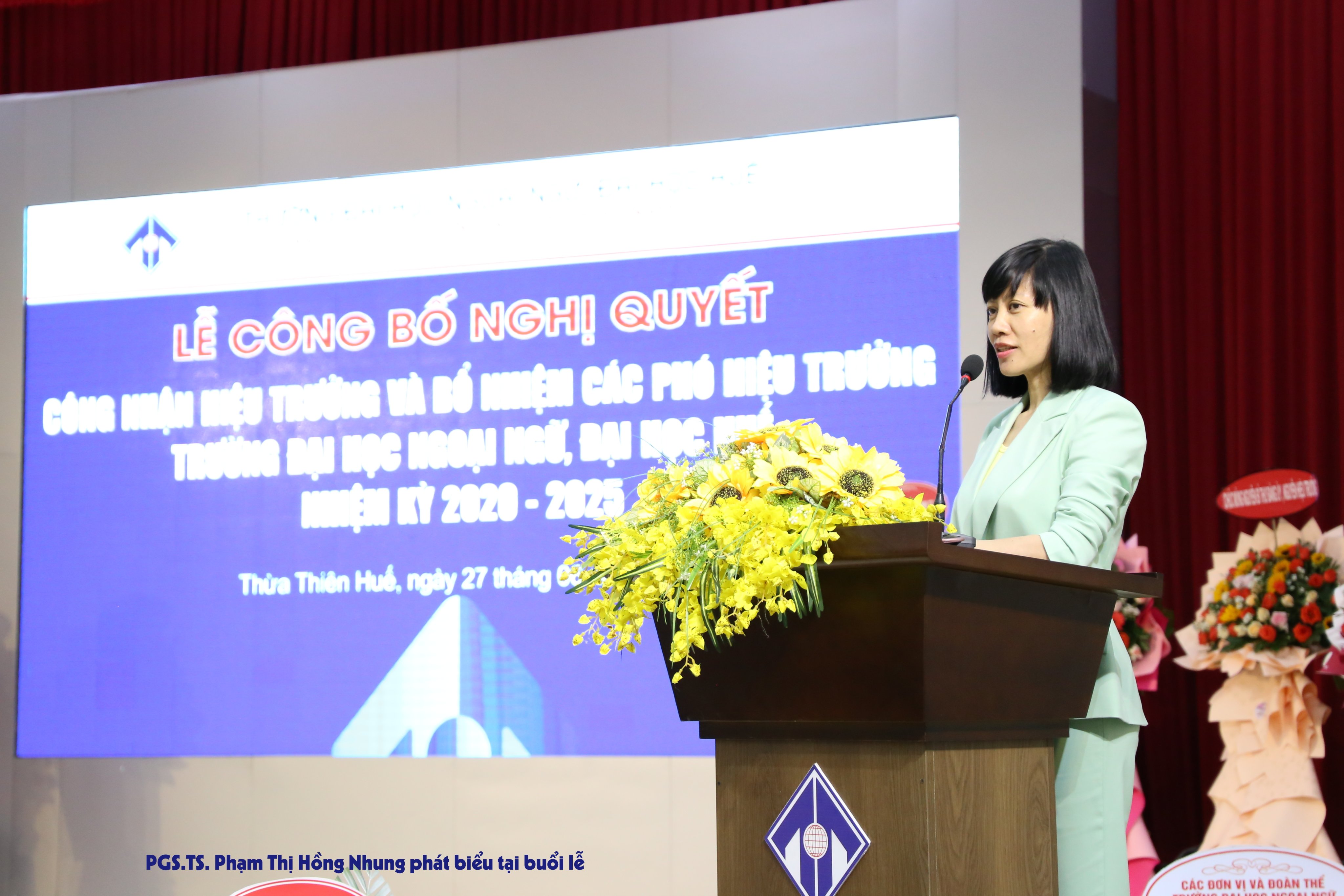 Phát biểu tại buổi lễ PGS.TS. Phạm Thị Hồng Nhung thay mặt cho Đảng ủy, Ban Giám hiệu bày tỏ lời cảm ơn đến Đảng ủy, Hội đồng, Ban Giám đốc Đại học Huế và toàn thể viên chức, lao động, học viên sinh viên Trường Đại học Ngoại ngữ đã tin tưởng, tín nhiệm để bổ nhiệm tiếp tục đảm nhiệm công tác nhiệm kỳ mới. Tiếp tục duy trì truyền thống đoàn kết trong Nhà trường, thực hiện tốt công tác quản lý, làm tốt vai trò người đứng đầu, tập hợp tất cả các nguồn lực trong Nhà trường để cùng nhau hoàn thành nhiệm vụ, mục tiêu và chiến lược phát triển Nhà trường trong thời gian tới.