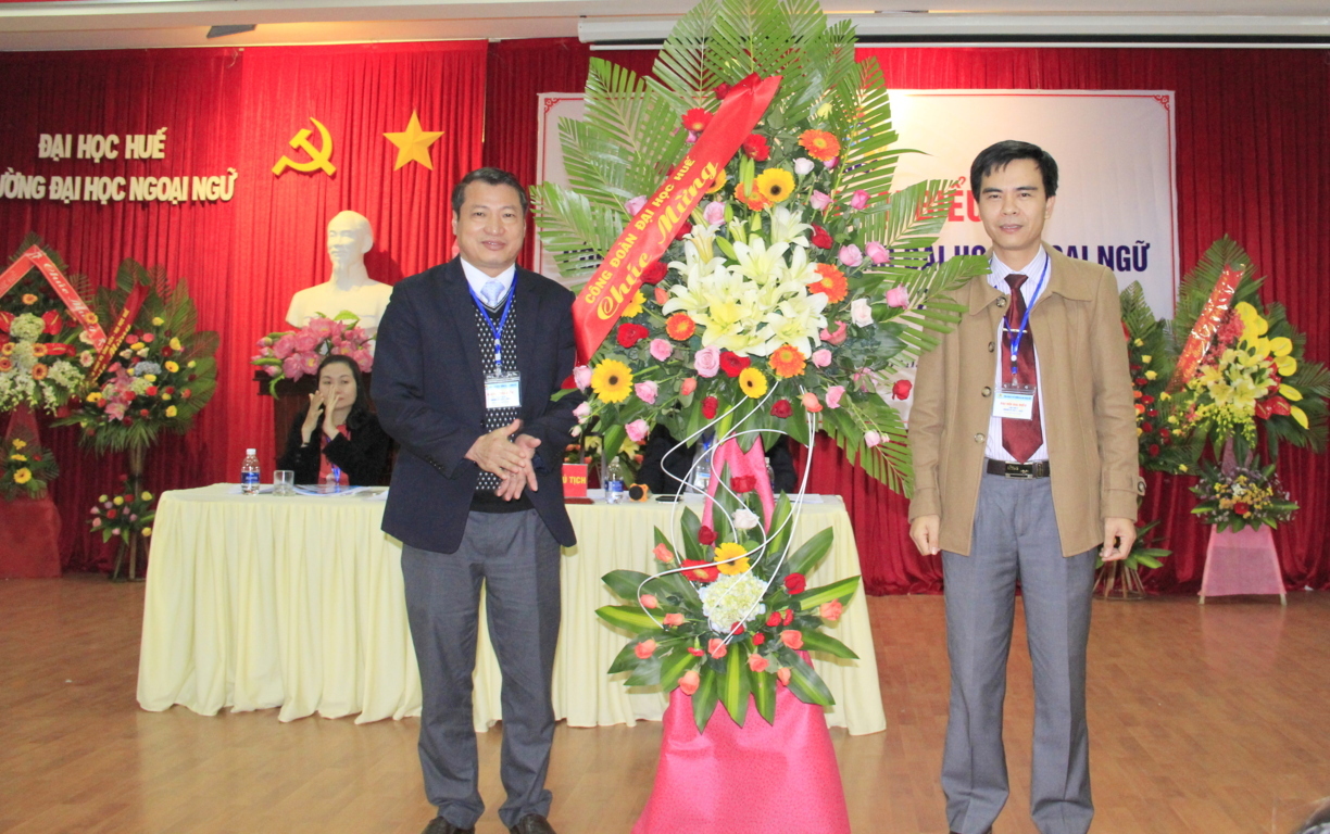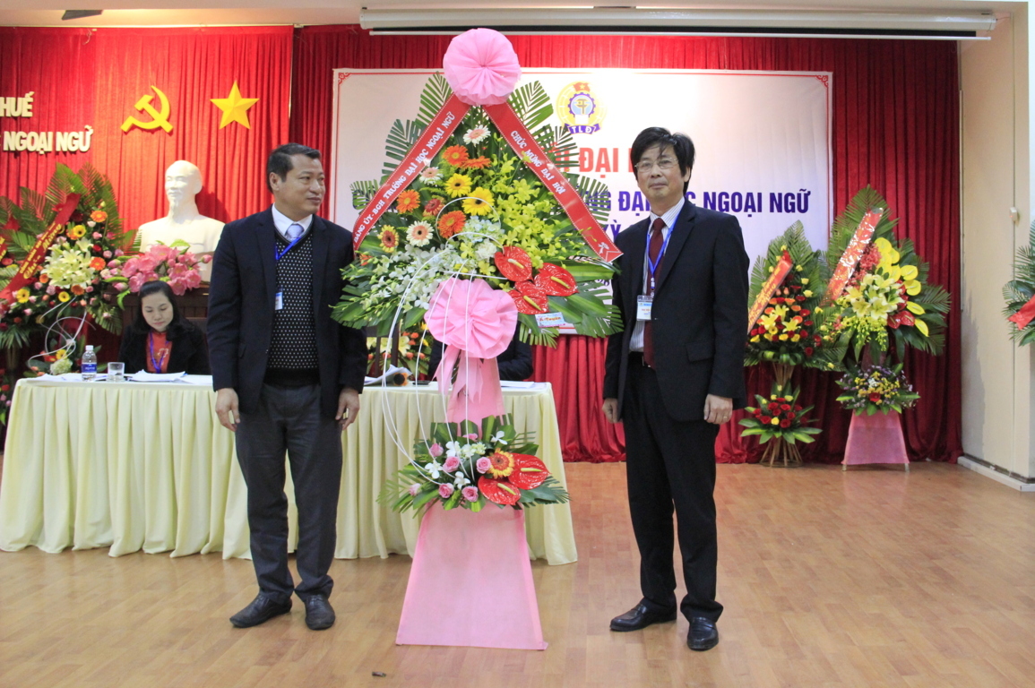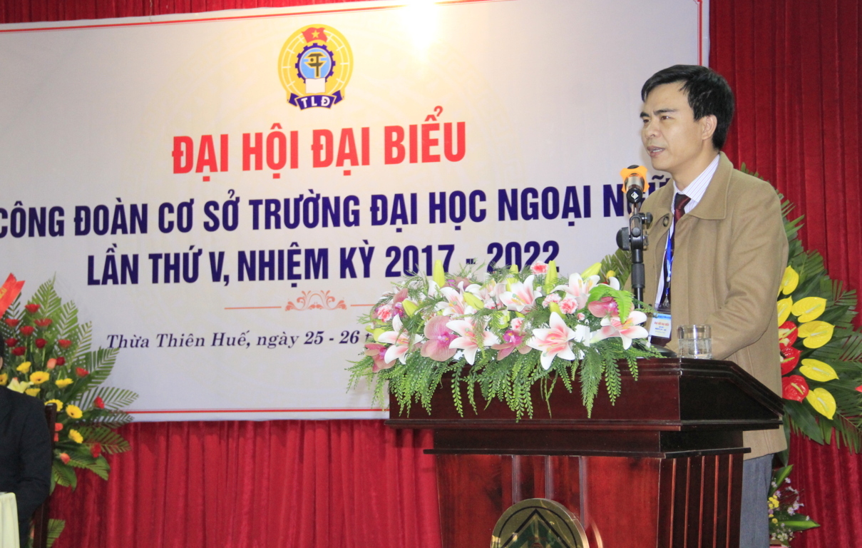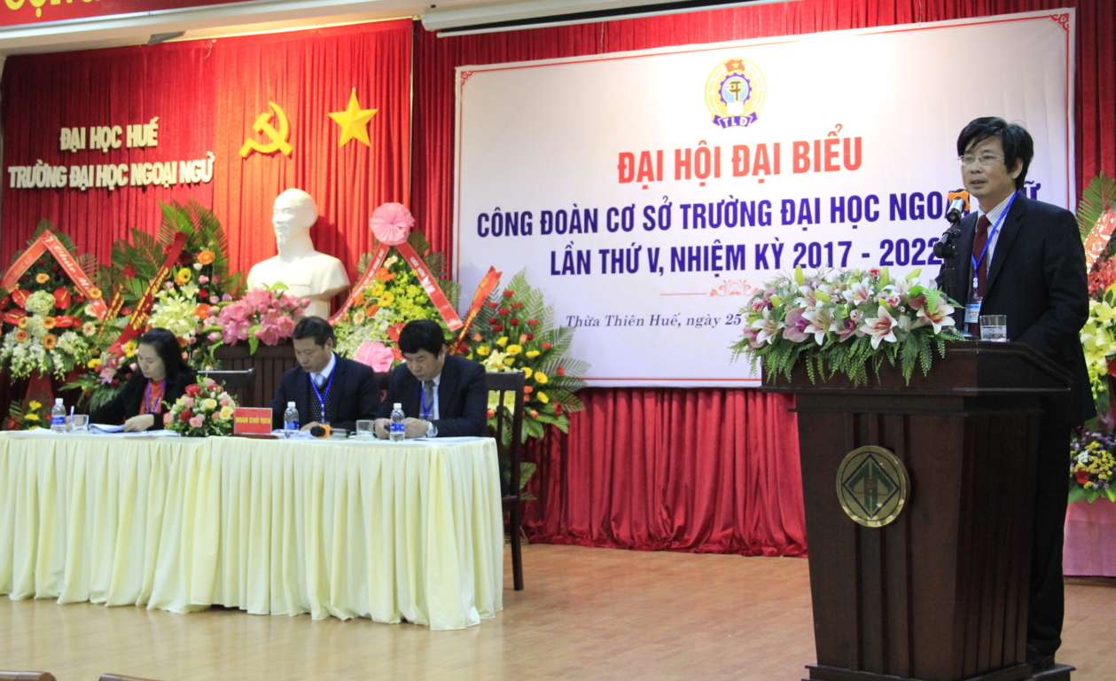 Phát biểu chỉ đạo Đại hội, TS. Nguyễn Công Hào, Phó chủ tịch Công đoàn Đại học Huế đã đánh giá cao những nỗ lực của Công đoàn cơ sở Trường Đại học Ngoại ngữ trong những năm qua, đã góp phần vào thành công chung của Công đoàn Đại học Huế. Nhiệm kỳ tới, trước những đòi hỏi phát triển và hội nhập sâu rộng, sự đổi mới một cách căn bản toàn diện của ngành giáo dục, Công đoàn Đại học Huế mong muốn Công đoàn cơ sở Trường Đại học Ngoại ngữ cần tiếp tục đổi chú trọng vào các nội dung trọng tâm sau: Công tác chính trị tư tưởng, nội bộ đoàn kết; Tích cực triển khai quy chế dân chủ ở cơ sở, bảo vệ lợi ích hợp pháp của người lao động, đề xuất thay đổi quy chế chi tiêu nội bộ; Cùng với chính quyền tham gia quản lý chuyên môn, đẩy mạnh NCKH, tăng cường ký kết các dự án liên kết đào tạo; Kiểm tra, giám sát các hoạt động của công đoàn; Đẩy mạnh hoạt động của công tác Nữ công trong thời gian tới.