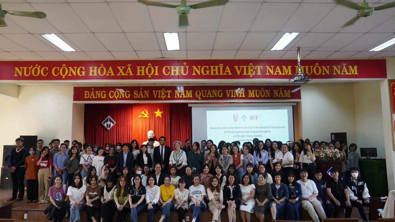 Sau thời gian tiếp kiến và làm việc với đại diện Ban Giám hiệu Nhà trường, đoàn công tác AUF đã tham dự giao lưu cùng tập thể giảng viên và sinh viên tiếng Pháp của Khoa Tiếng Pháp - Tiếng Nga. Tại đây, sinh viên tiếng Pháp đã giới thiệu với đoàn về thành phố Huế và du lịch Huế. Bên cạnh đó, sinh viên tiếng Pháp cũng đã giới thiệu với đoàn công tác AUF về các hoạt động Pháp ngữ được tổ chức tại Khoa Tiếng Pháp - Tiếng Nga và trình bày về những thuận lợi cũng như khó khăn trong quá trình học tiếng Pháp, trên cơ sở đó trình bày ý tưởng thành lập câu lạc bộ pháp ngữ để hỗ trợ hiệu quả cho việc học tiếng Pháp cũng như quảng bá pháp ngữ ở Huế. Phía bà Phó Giám đốc cũng đã có phần giao lưu, giới thiệu sơ lược về AUF và trả lời một số câu hỏi của sinh viên về việc hỗ trợ tổ chức các hoạt động pháp ngữ cũng như trao đổi sinh viên về học thuật. Kết thúc chương trình, đoàn công tác đã chụp ảnh lưu niệm cùng tập thể giảng viên và sinh viên tiếng Pháp, với niềm tin tưởng về những hợp tác pháp ngữ tốt đẹp trong tương lai.