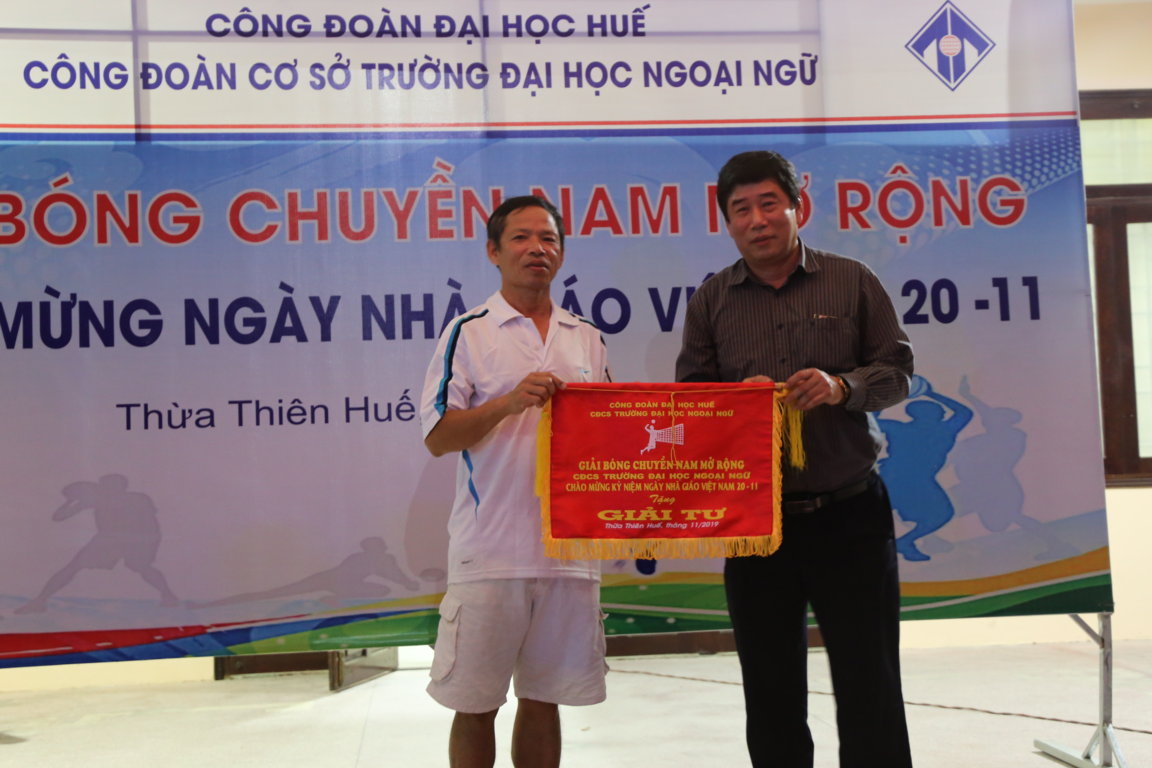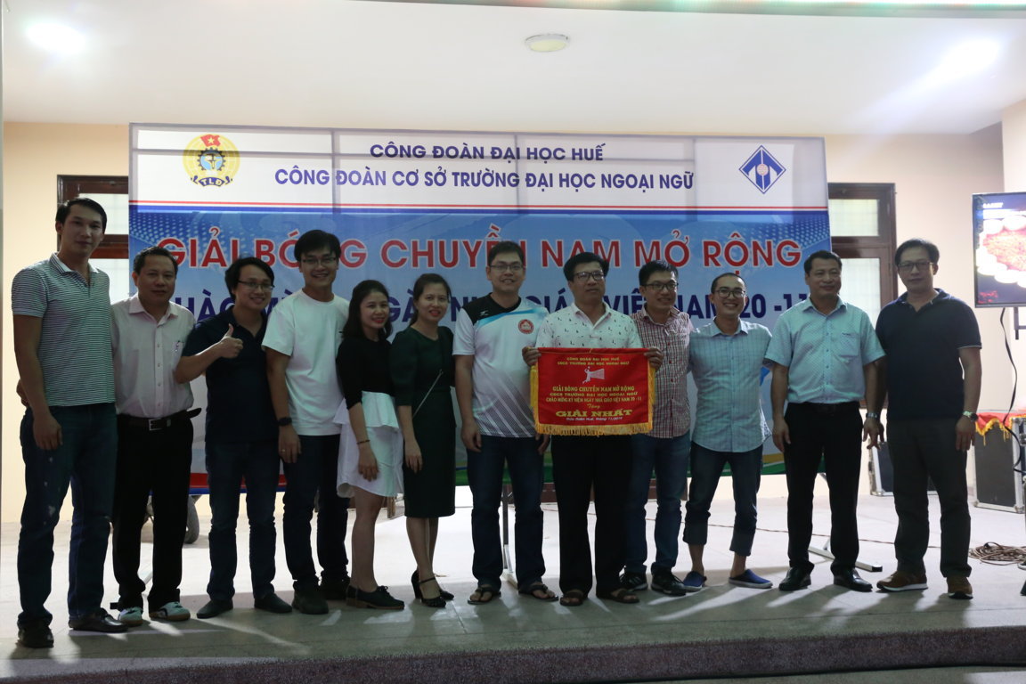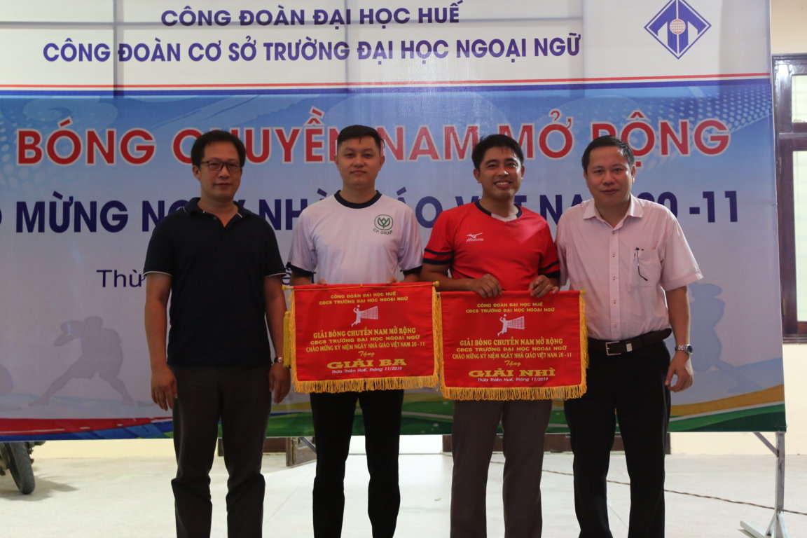 HUCFL- Với tinh thần giao lưu, thắt chặt tình đoàn kết giữa các đơn vị trong Đại học Huế và học viên của Nhà trường, ngày (17/11) tại nhà thi đấu Khoa Giáo dục Thể chất, Công đoàn cơ sở Trường Đại học Ngoại ngữ đã tổ chức giải bóng chuyền nam mở rộng chào mừng kỷ niệm 37 năm ngày Nhà giáo Việt Nam 20/11, tham dự giải có 06 đội: Công đoàn cơ sở Trường Đại học Sư phạm, Công đoàn cơ sở Trường Đại học Nông Lâm, Công đoàn cơ sở Trường Đại học Kinh tế, Công đoàn cơ sở cơ quan Đại học Huế, Học viên Bằng 2 tiếng Anh tại Quảng Trị và Công đoàn cơ sở Trường Đại học Ngoại ngữ.