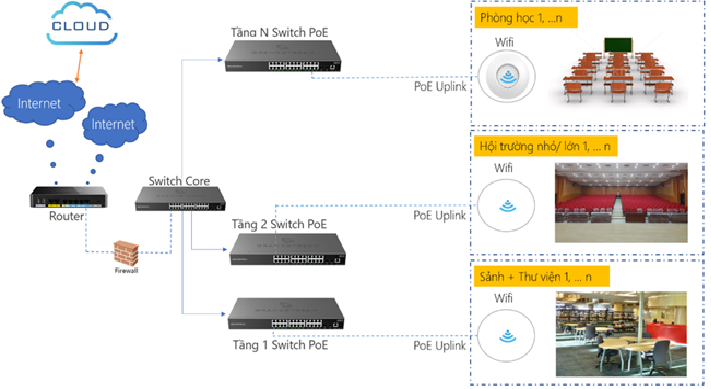 Các Access Point (điểm phát WiFi) được lắp đặt khoa học, kết hợp với hệ thống switch mạng và cấp nguồn PoE hiện đại, giúp tín hiệu mạnh và đều khắp khuôn viên.