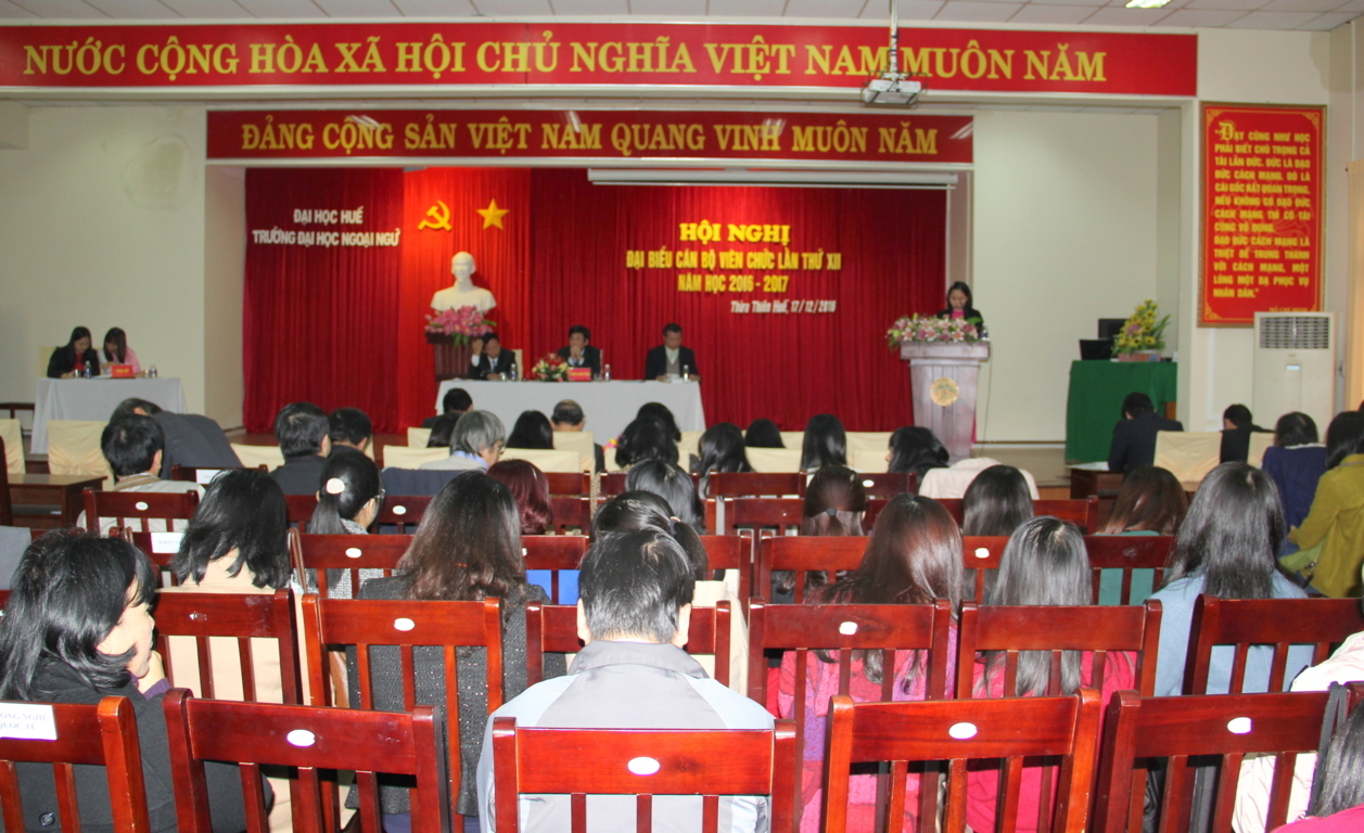 Sáng ngày (17/12), Hội nghị đại biểu cán bộ viên chứcTrường Đại học Ngoại ngữ, Đại học Huế lần thứ XII, năm học 2016 – 2017đã diễn ra với sự tham gia của 154 đại biểu đại diện cho 301 cán bộ, viên chức của Trường.Hội nghị đại biểu cán bộ viên chức là hoạt động thường niên của Trường nhằm tổng kết công tác quản lý, dạy và học của tập thể cán bộ viên chức và sinh viên toàn Trường năm học 2015 – 2016 và đề ra chương trình hành động trong năm học 2016 – 2017.