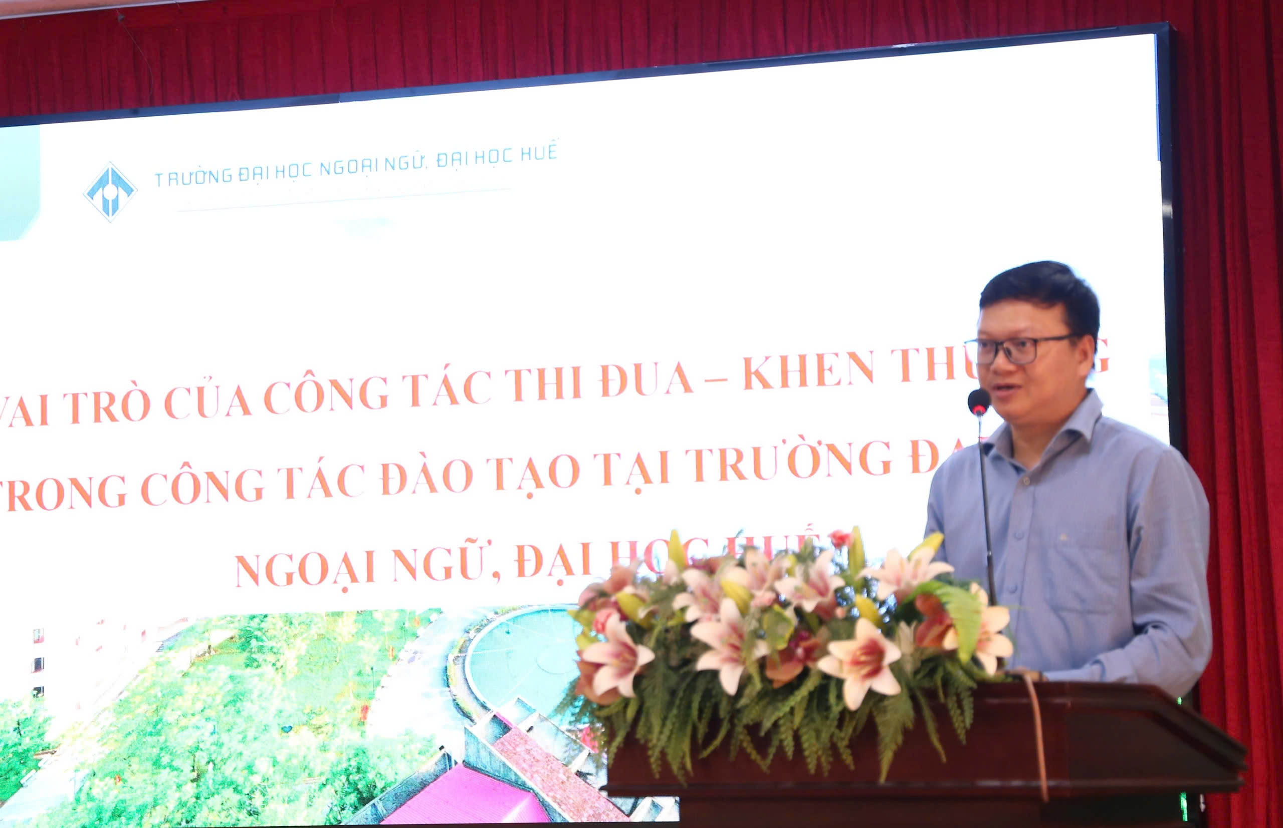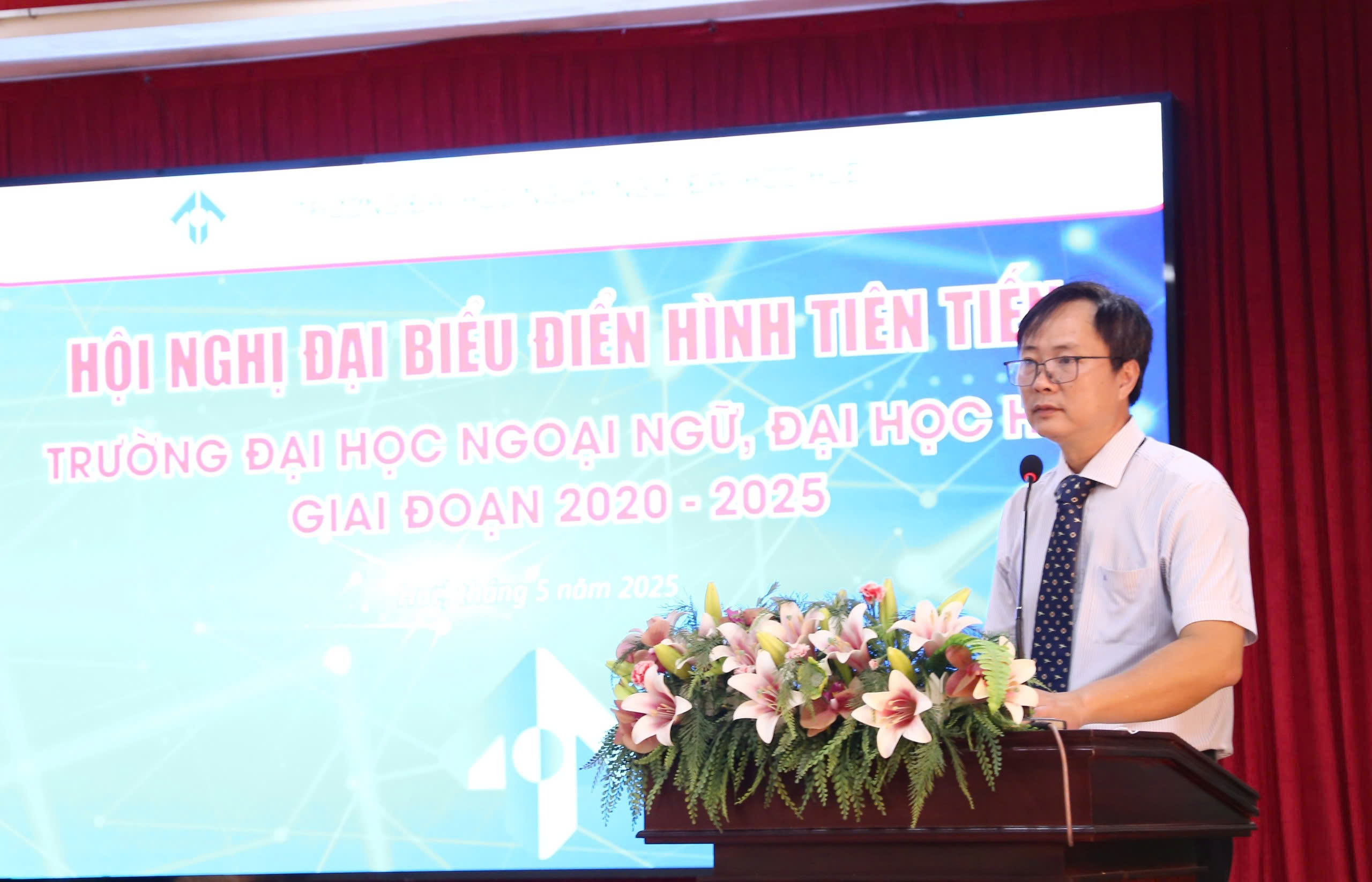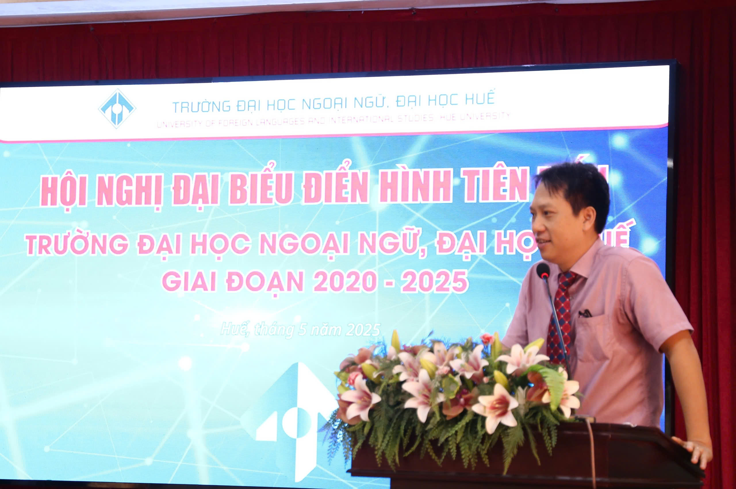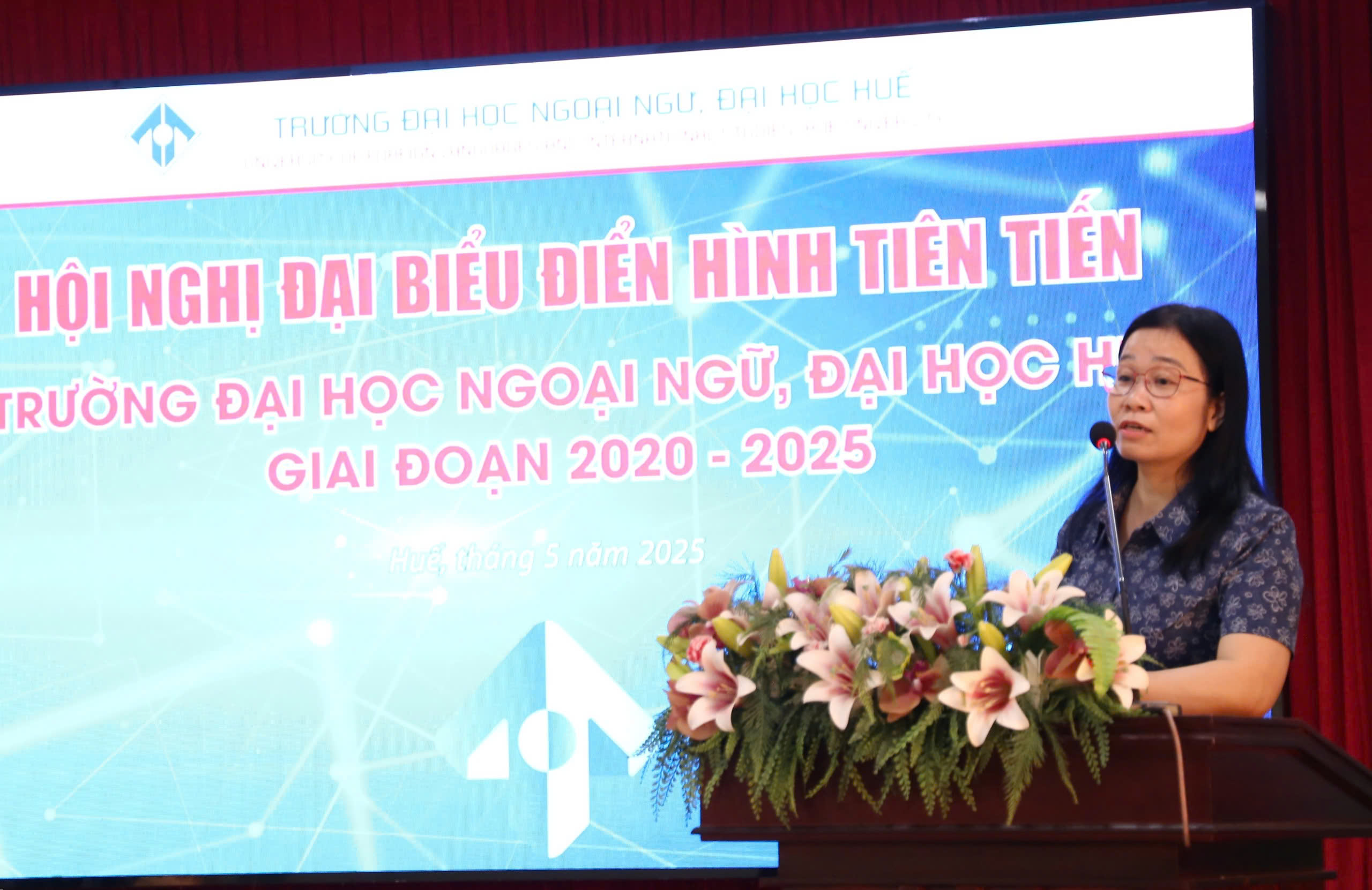 Ngày 08/5/2025, Trường Đại học Ngoại ngữ, Đại học Huế tổ chức Hội nghị điển hình tiên tiến giai đoạn 2020 - 2025 nhằm đánh giá kết quả thực hiện phong trào thi đua yêu nước và kết quả thi đua khen thưởng giai đoạn 2020 - 2025; khẳng định những kết quả đạt được và chỉ ra những hạn chế cần khắc phục. Đồng thời, thông qua Hội nghị, Nhà trường cũng đề ra phương hướng, mục tiêu, chỉ tiêu, nhiệm vụ, giải pháp đẩy mạnh phong trào thi đua và nâng cao hiệu quả thực hiện công tác thi đua, khen thưởng giai đoạn 2025 - 2030.