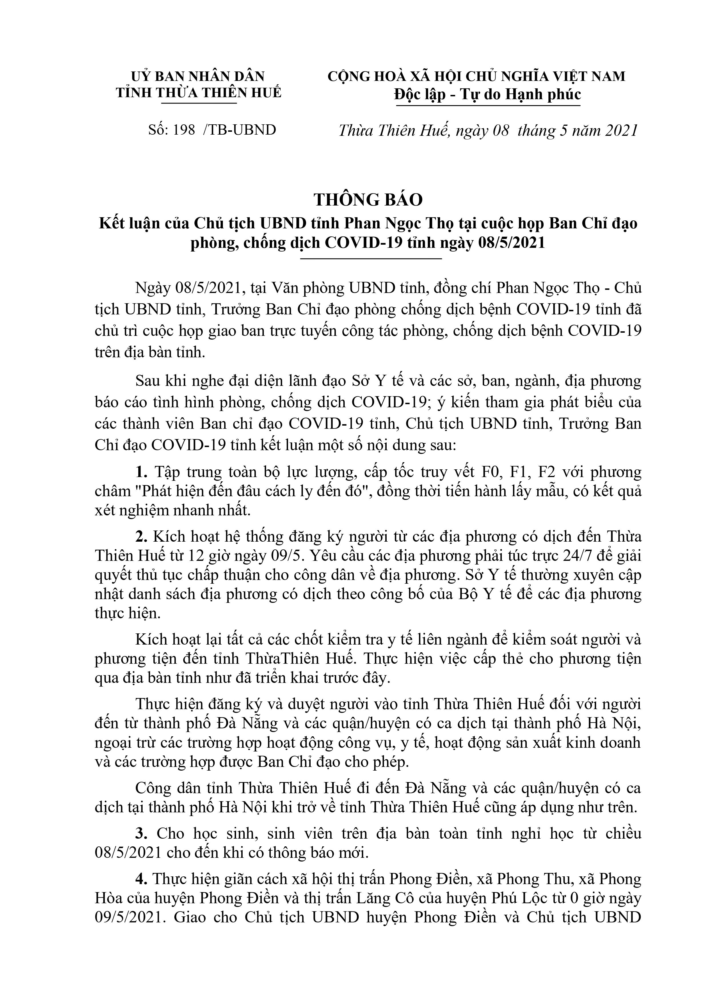 Kết luận của CT UBND tỉnh Thừa Thiên Huế tại cuộc họp Ban chỉ đạo phòng, chống dịch COVID-19 ngày 8/5/021 08-05-2021