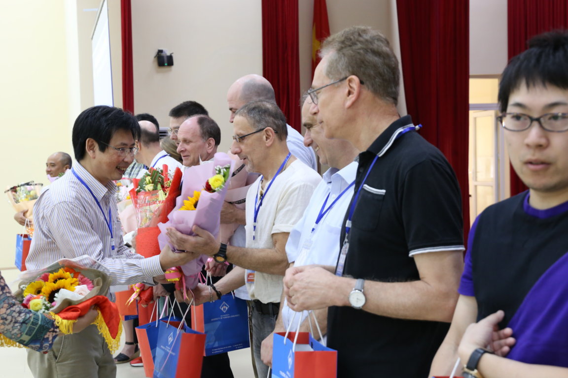 Hiệu trưởng tặng hoa và chụp ảnh lưu niệm cùng các đại biểu
