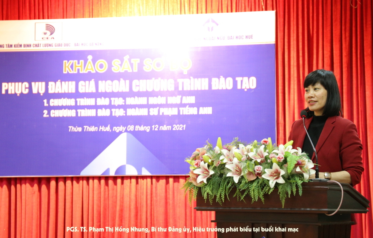 Phát biểu tại khai mạc, PGS. TS. Phạm Thị Hồng Nhung cảm ơn đoàn đã nhiệt tình, trực tiếp giúp đỡ Nhà trường mặc dù trong bối cảnh dịch bệnh Covid-19 đang diễn biến phức tạp. Nhà trường đã và đang xác định vai trò quan trọng của công tác kiểm định chất lượng giáo dục và mong muốn quá trình kiểm định sẽ mang lại cho Trường cơ hội tự đánh giá và để có những giải pháp nhằm tiếp tục nâng cao chất lượng giáo dục và đào tạo, khẳng định được uy tín và vị thế của mình đối với xã hội. Nhà trường mong muốn nhận được sư hỗ trợ tốt nhất của đoàn khảo sát để hoàn thiện về Báo cáo tự đánh giá, bổ sung các tiêu chí, minh chứng và chuẩn bị cơ sở vật chất tốt nhất để phục vụ quá trình đánh giá chính thức trong thời gian tới.