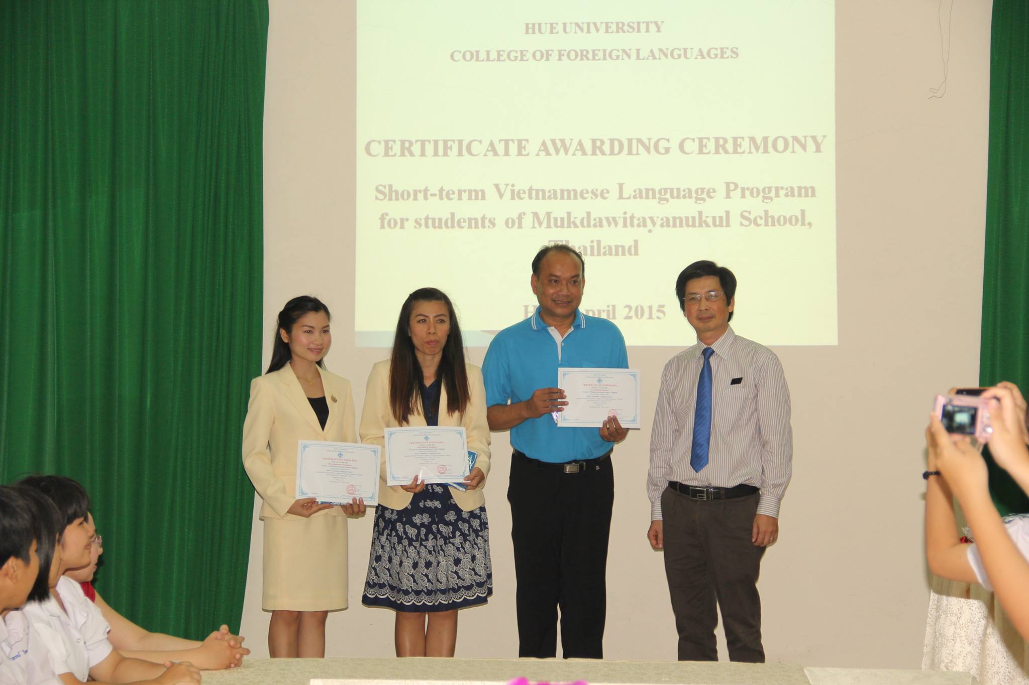 Sau khi khóa học kết thúc, Trường ĐH Ngoại ngữ  đã có buổi tổng kết trao chứng nhận cho giáo viên và học sinh của đoàn. TS. Bảo Khâm - Bí thư Đảng ủy, Hiệu trưởng Nhà trường đã đến tham dự, phát biểu tổng kết và trao chứng nhận cho đoàn. Đại diện của đoàn Thái Lan đã phát biểu cảm ơn và mong muốn sẽ được tiếp tục đưa thêm nhiều khóa học sinh sang học tiếng Việt tại trường ĐH Ngoại ngữ trong thời gian tới.