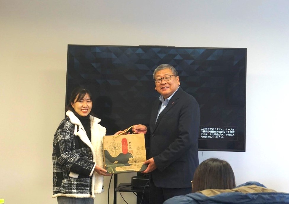 (Cô Hoàng Thị Ngọc Bích – giảng viên của Khoa NN&VH Nhật Bản chụp ảnh lưu niệm cùng với Ông Yasuyoshi Ohira – Giám đốc điều hành Học viện Anabuki)