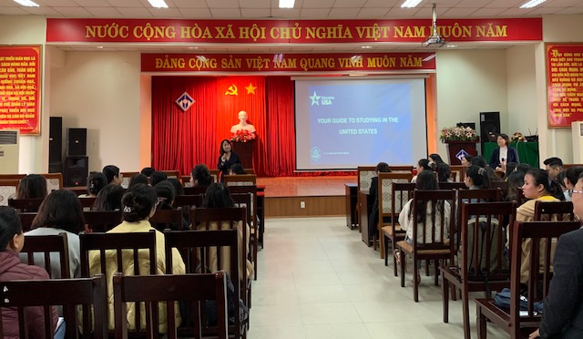 Sau buổi đón tiếp, Trường Đại học Ngoại ngữ, Đại học Huế phối hợp với Tổng Lãnh sự quán Hoa kỳ tại Thành phố Hồ Chí Minh tổ chức buổi chia sẻ thông tin về chương trình học bổng của chính phủ Hoa Kỳ, giới thiệu về chương trình học bổng Fulbright, đặc biệt tập trung vào chương trình học bổng Thạc sĩ, kinh nghiệm chuẩn bị hồ sơ học bổng, xin học bổng cho giảng viên, sinh viên. Buổi chia sẻ diễn ra trong không khí sôi nổi, thân thiện và đã đem đến những thông tin hữu ích về các chương trình học bổng, kinh nghiệm trong việc tìm học bổng và các kĩ năng cần thiết trong chuẩn bị hồ sơ cho các giảng viên trẻ và sinh viên tham dự.