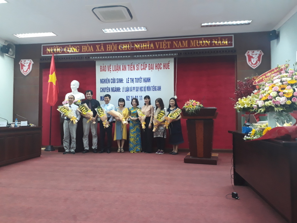 Ngày 24 tháng 9 năm 2018, Trường Đại học Ngoại ngữ, Đại học Huế đã tổ chức thành công Lễ bảo vệ luận án tiến sĩ cấp Đại học Huế cho nghiên cứu sinh (NCS) Lê Thị Tuyết Hạnh, chuyên ngành Lý luận và phương pháp dạy học bộ môn tiếng Anh, khóa năm 2014.