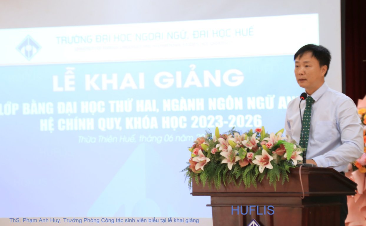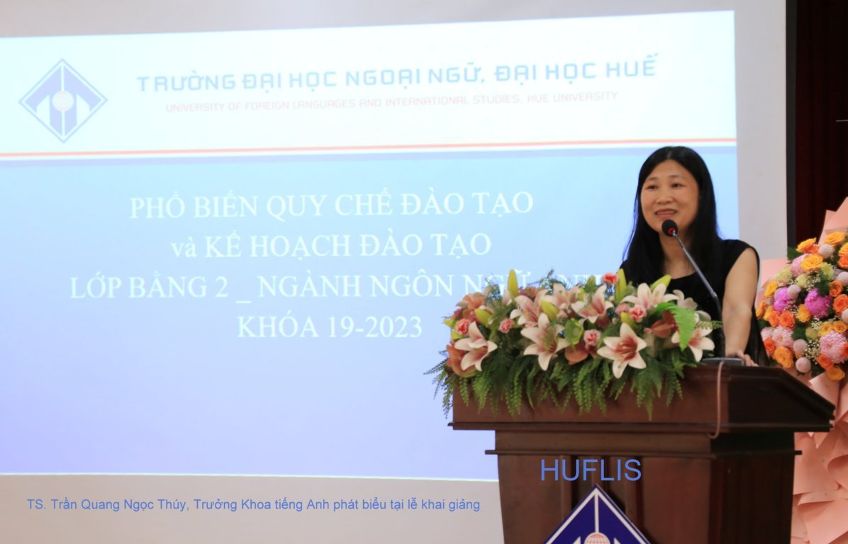 Phát biểu khai mạc, TS. Nguyễn Hồ Hoàng Thủy, Phó hiệu trưởng Nhà trường đã gửi lời chúc mừng tới các tân học viên khóa 2023-2026. TS. Nguyễn Hồ Hoàng Thủy khẳng định Trường Đại học Ngoại ngữ, Đại học Huế với truyền thống xây dựng và phát triển, với những thành tích đã đạt được, Trường đầy đủ các yếu tố để mang đến những khóa học đảm bảo chất lượng, đáp ứng được sự tin tưởng và kỳ vọng của các học viên. Nhà trường cam kết luôn sẵn sàng đồng hành cùng các học viên nhằm hỗ trợ một cách tốt nhất để các học viên đạt được kết quả cao trong thời gian học tập tại Trường. Chúc các bạn học viên sau khi tham gia khóa đào tạo tại Trường có đủ kiến thức, kỹ năng để thực hiện được các hoài bão, ước mơ của mình.