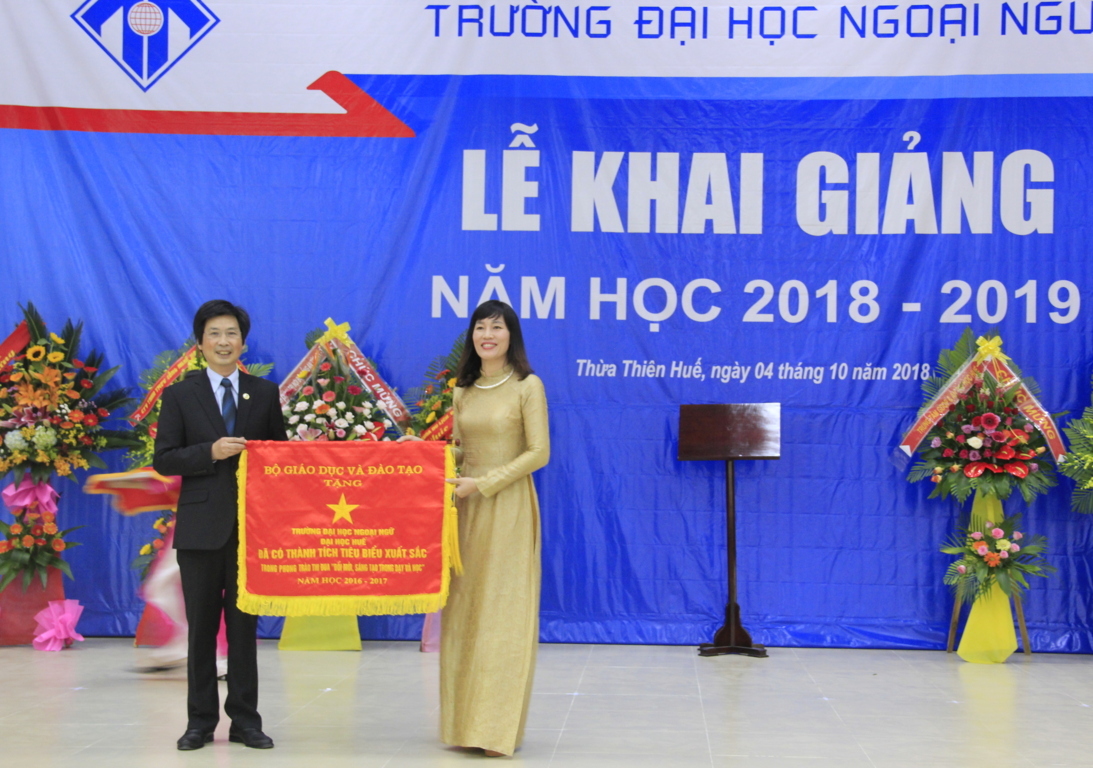 TS Đỗ Thị Xuân Dung – Phó Giám đốc Đại học Huế trao cờ thi đua cho Nhà trường