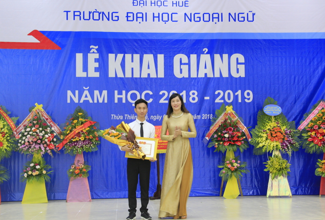 TS Đỗ Thị Xuân Dung – Phó Giám đốc Đại học Huế trao giấy khen và phần thưởng cho Sinh viên Nguyễn Quốc Thạch đạt danh hiệu Thủ khoa Trường