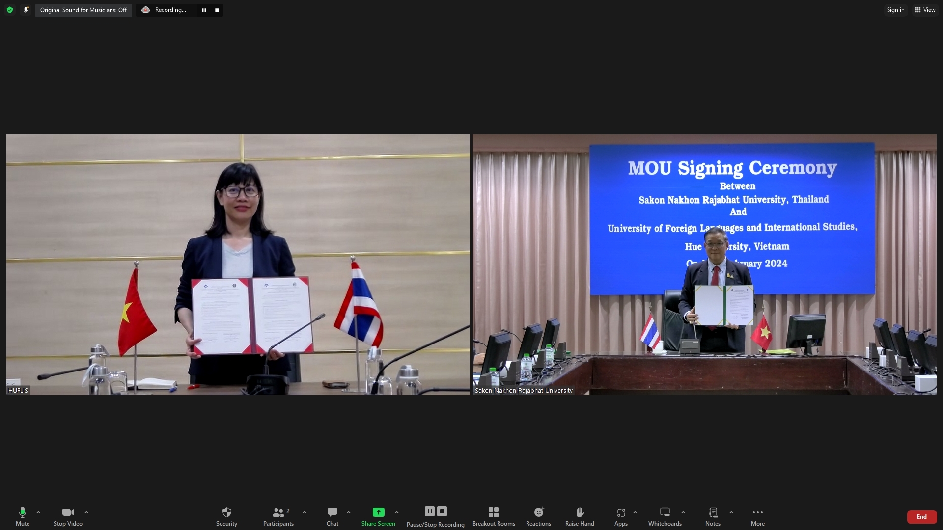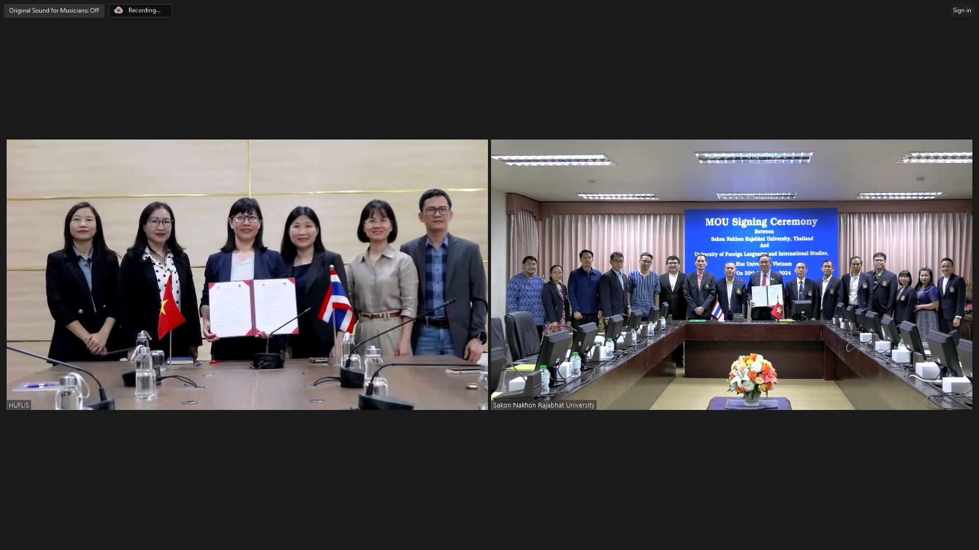 HUFLIS- Ngày 20/2/2024, Trường Đại học Ngoại ngữ, Đại học Huế (HUFLIS) đã tổ chức lễ ký trực tuyến biên bản thỏa thuận hợp tác với Trường Đại học Sakon Nakhon Rajabhat, Thái Lan (SNRU). PGS.TS. Chakrit Chanchitprecha, Hiệu trưởng SNRU và PGS.TS. Phạm Thị Hồng Nhung, Hiệu trưởng HUFLIS, đại diện hai đơn vị thực hiện lễ ký.