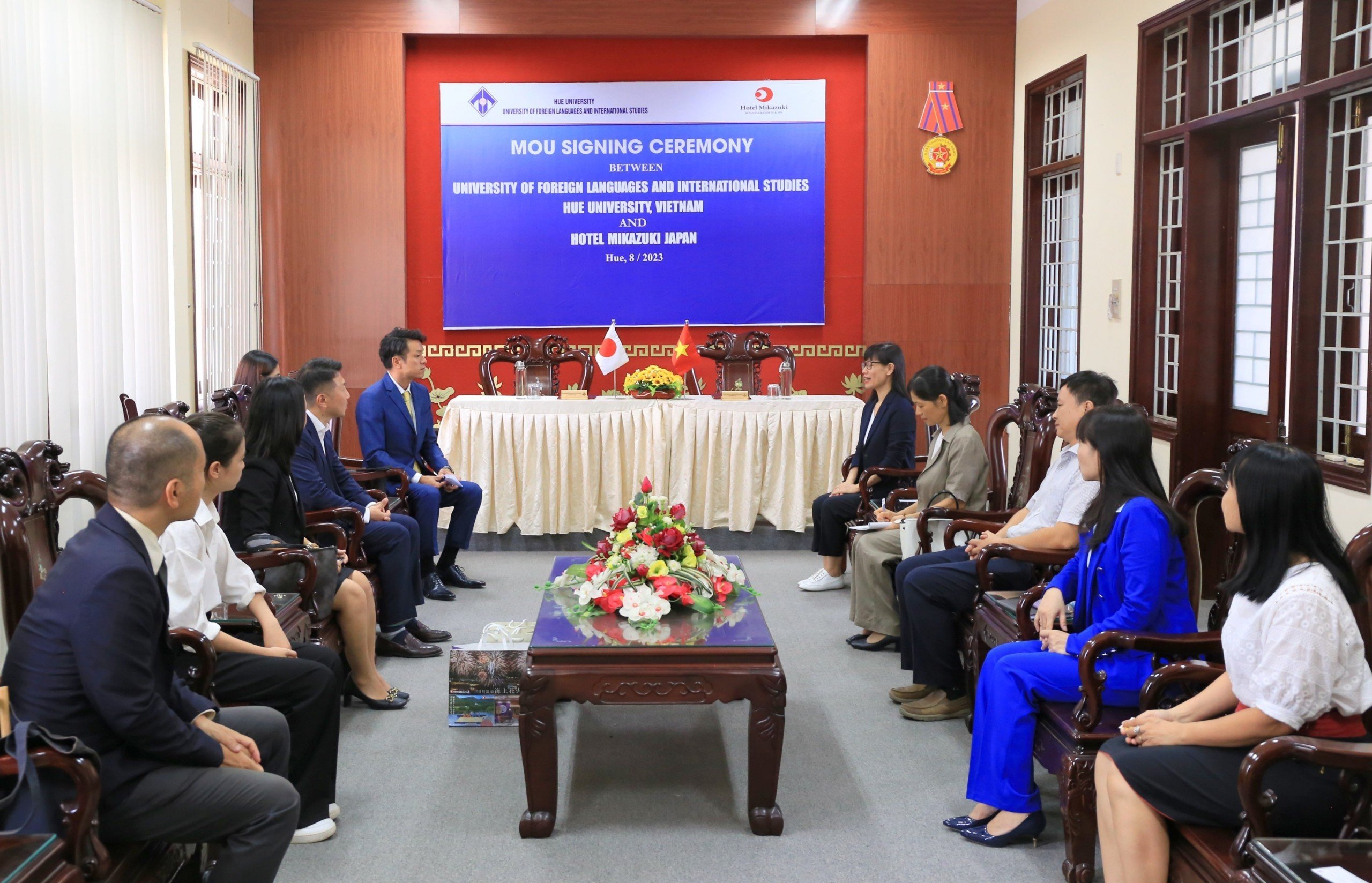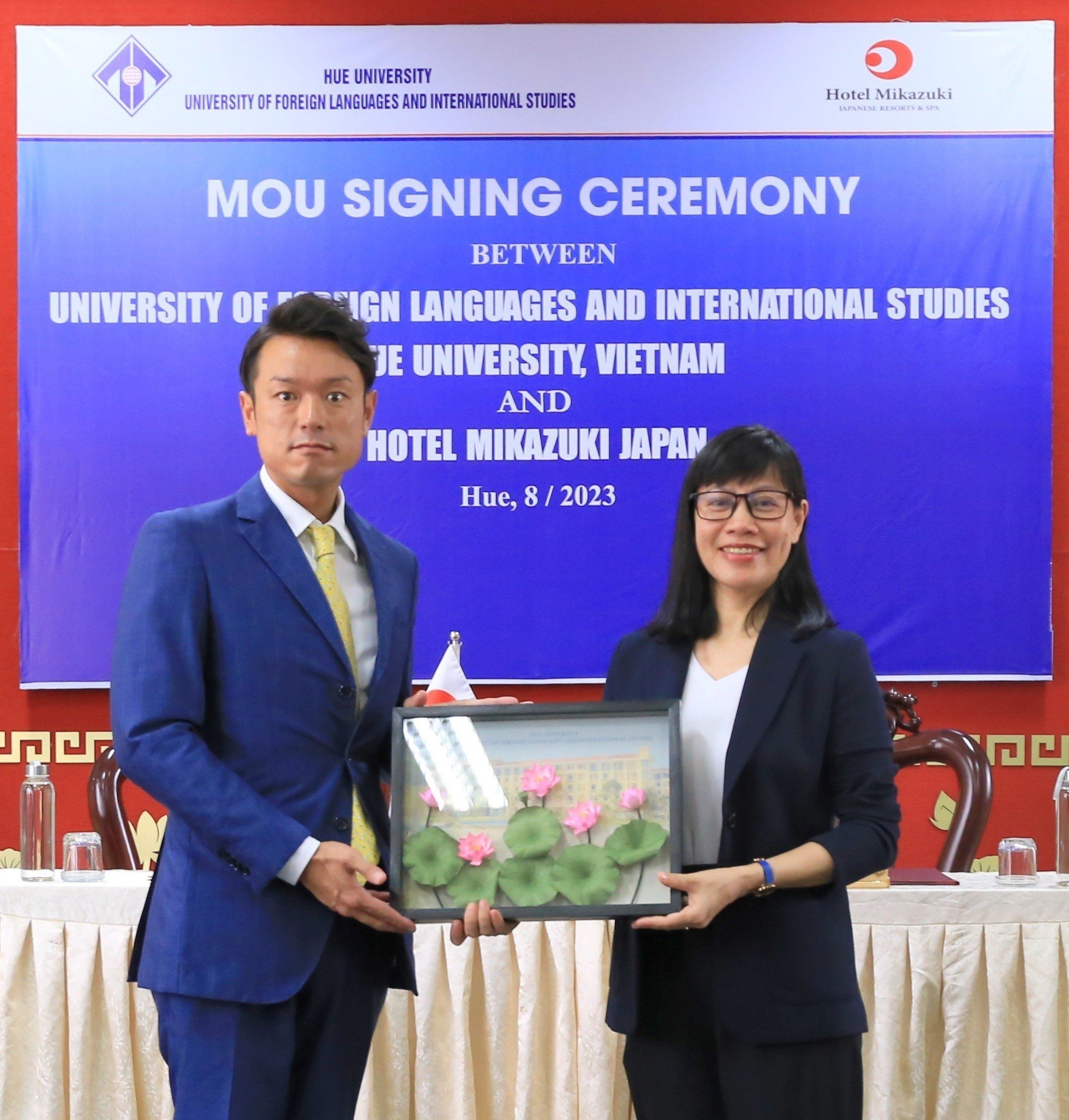 Về phía đại diện tập đoàn Mikazuki Nhật Bản, Ông Odaka Yoshimune cho biết Mikazuki Nhật Bản đã hợp tác nhiều năm với các Trường Đại học ở Việt Nam và thực hiện thành công việc tiếp nhận sinh viên đến thực tập tại các khách sạn Mikazuki ở Nhật Bản. Mikazuki đảm bảo hoạt động thực tập của sinh viên Trường Đại học Ngoại ngữ, Đại học Huế sẽ phù hợp với ngành đào tạo, giúp sinh viên có cơ hội giao tiếp và phát triển kỹ năng ngôn ngữ, học hỏi về văn hóa Nhật Bản nói chung và văn hóa làm việc của người Nhật nói riêng.