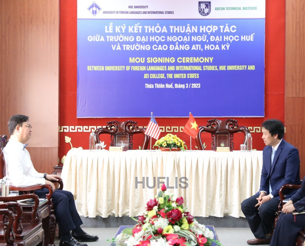 HUFLIS - Ngày 15/3/2023, Trường Đại học Ngoại ngữ, Đại học Huế đã tổ chức ký biên bản thỏa thuận hợp tác với Trường Cao Đẳng ATI, Hoa Kỳ. TS. Brian Kim, Hiệu Trưởng Trường Cao Đẳng ATI và TS.Nguyễn Văn Huy, Phó Hiệu trưởng Trường Đại học Ngoại ngữ, Đại học Huế (HUFLIS) đại diện hai đơn vị tham gia buổi lễ ký kết.