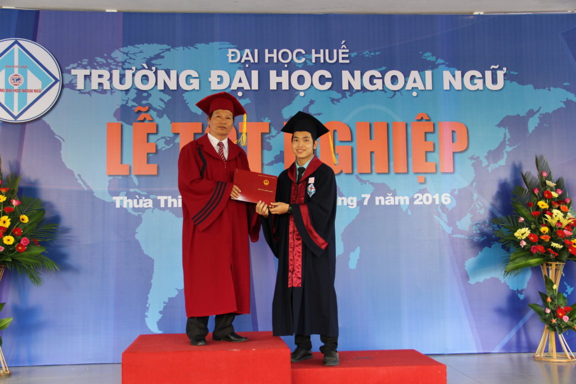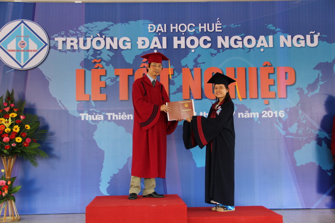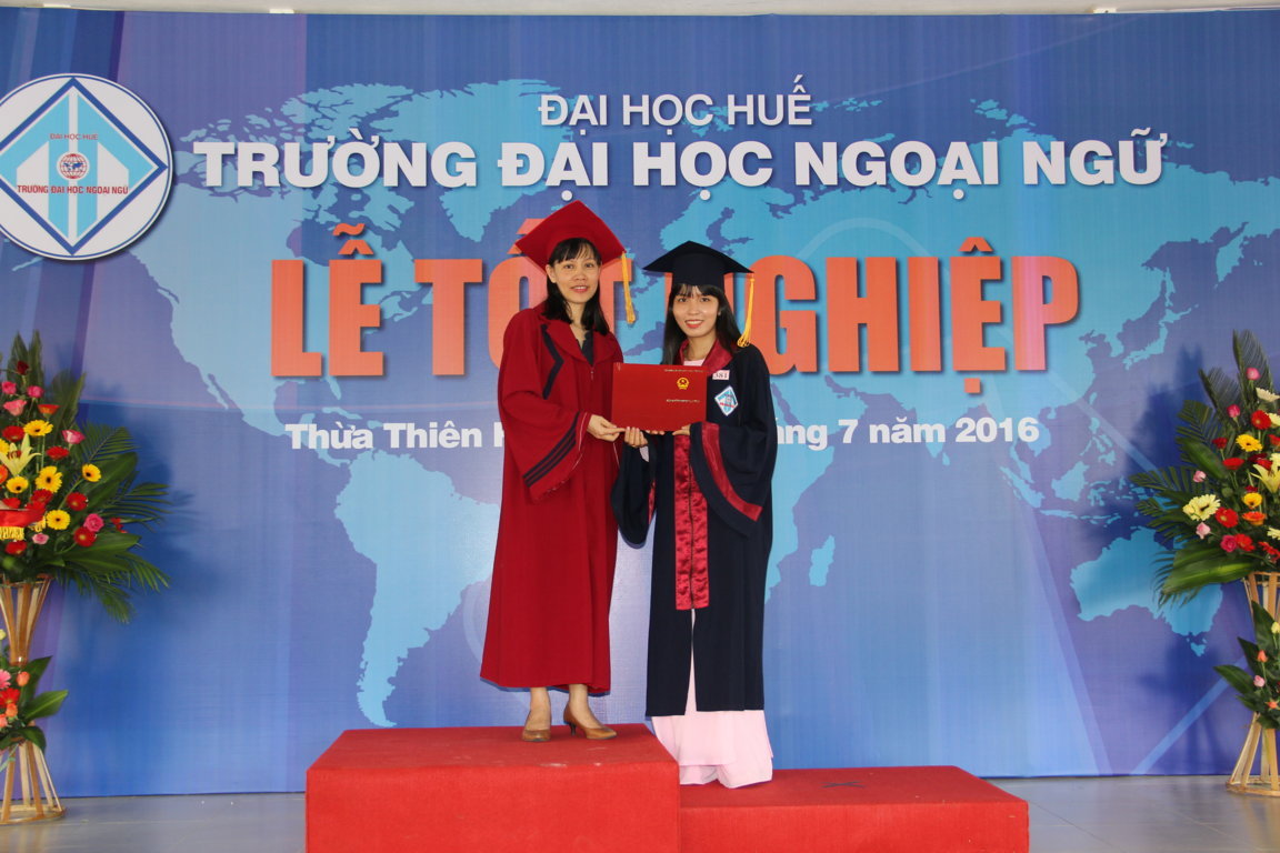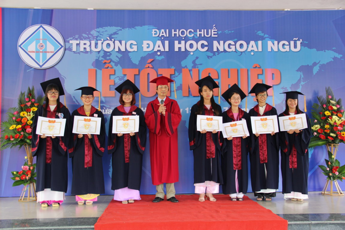 Kỷ niệm 12 năm ngày thành lập trường (13/7/2004 – 13/7/2016) Trường Đại học Ngoại ngữ lọng trọng tổ chức lễ tốt nghiệp cho 793 sinh viên. Trong đó có 10 sinh viên đạt xuất sắc chiếm tỉ lệ 1,03%; 123 sinh viên đạt giỏi chiếm tỉ lệ 12,71%; 618 sinh viên đạt khá chiếm tỉ lệ 63,84%. Phát biểu tại lễ tốt nghiệp TS. Bảo Khâm, Hiệu trưởng Nhà trường chúc mừng các sinh viên, cảm ơn quý thầy cô giáo, cán bộ viên chức Trường, cảm ơn sự quan tâm chỉ đạo saau sát của quý cấp lãnh đạo Đại học Huế, sử ủng hộ và tạo điều kiện của các ban ngành địa phương, đặc biệt là sự phấn đấu không ngừng của các em sinh viên. Lễ tốt nghiệp đánh dấu sự khởi đầu cho những ngày ở trường đời. Các em bắt đầu một trường học mới với nhiều thách thức mới và cũng hứa hẹn nhiều thành công mới với những kiến thức mà các em đã được trang bị trong suốt 4 năm ở Trường. Chúc các em sức khỏe, đủ tự tin, thừa nhiệt huyết để bước vào đời và gặt hái được nhiều thành công. Mong rằng dù ở nơi đâu, dù trong hoàn cảnh nào các em vẫn không quên ngồi trường Trường Đại học Ngoại ngữ thân yêu.
