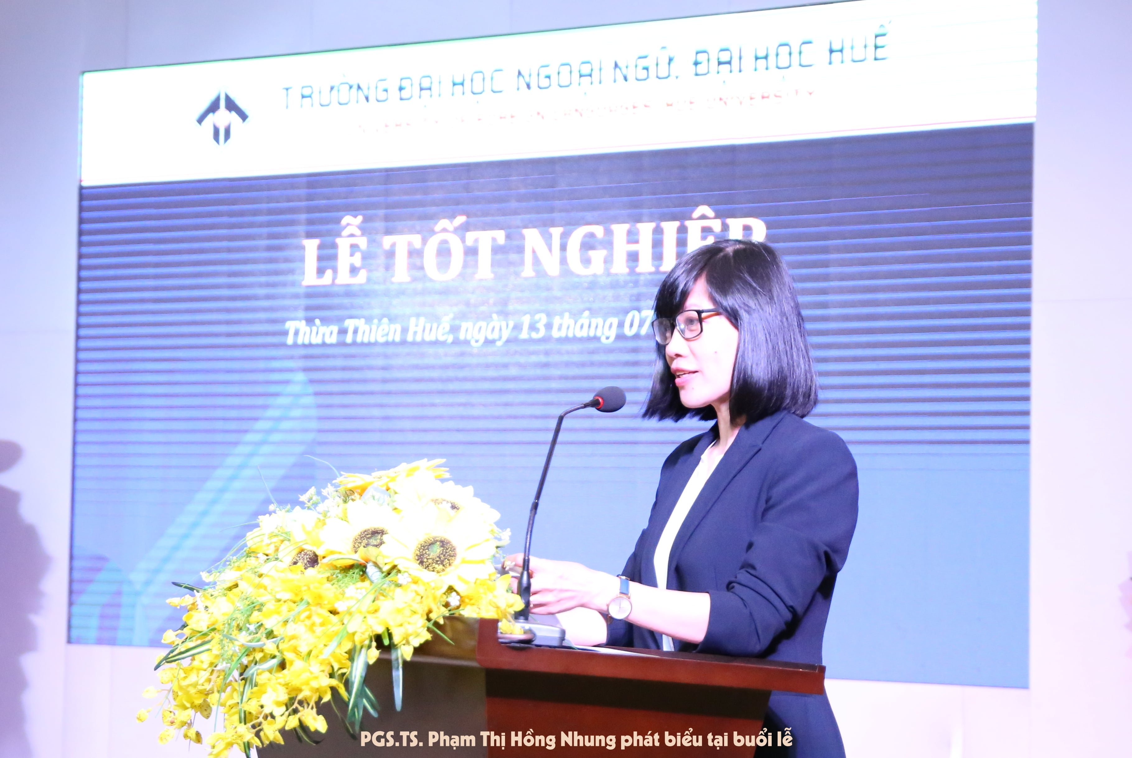 Phát biểu tại buổi lễ PGS.TS Phạm Thị Hồng Nhung nhiệt liệt chúc mừng các tân tiến sĩ, tân thạc sĩ và tân cử nhân đã nỗ lực phấn đấu, rèn luyện trong suốt những năm qua để có mặt trong buổi lễ trao bằng ngày hôm nay. Nhắn nhủ tới các tân cử nhân Hiệu trưởng Nhà trường chia sẻ: “Trải qua những năm học tập và phấn đấu không mệt mỏi, vượt qua nhiều khó khăn, đặc biệt là trước đại dịch Covid-19 chưa từng có trong lịch sử nhưng với quyết tâm học tập, nổ lực gấp hai, gấp ba để khắc phục mọi khó khăn để hôm nay tại buổi lễ trang trọng này, chắc hẳn mỗi em đều có những cảm xúc khác nhau, có vui mừng và tự hào, có hi vọng và ước mơ, có cảm xúc vấn vương và tiếc nuối khi sắp phải chia tay bạn bè và mái trường”. Hi vọng rằng những kỉ niệm đó sẽ là hành trang để các em tiếp tục bước đi trên con đường sự nghiệp của mình, đồng thời phát huy những giá trị tri thức đã thu nhận được vào thực tiễn cuộc sống, trở thành những người có ích cho xã hội. Chúc các em đạt được những thành công, khát vọng và hoài bão trên bước đường tương lai của mình để trở thành những công dân khởi nghiệp thành công. Sự thành công của các em chính là sứ mạng và mục tiêu Nhà trường luôn hướng tới. Chúc các em đủ nghị lực, đủ yêu thương, đủ đam mê và đủ kiên trì để thành công trên con đường đã chọn.