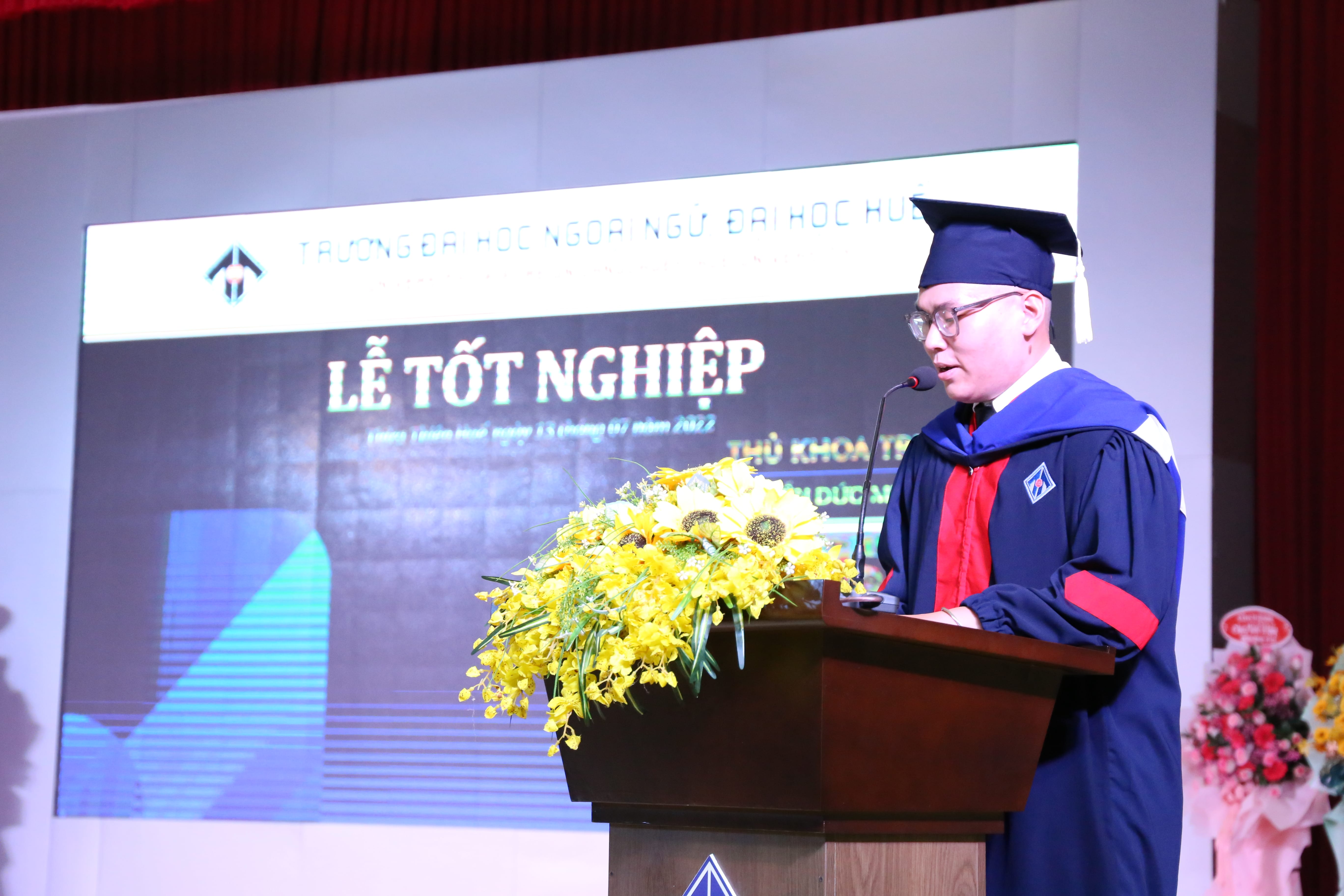 Tân cử nhân Nguyễn Đức Minh Hoàng ngành Ngôn ngữ Pháp tốt nghiệp thủ khoa Trường đại diện các tân tiến sĩ, thạc sĩ và cử nhân gửi lời tri ân đến lãnh đạo Nhà trường, các thầy, cô giáo đã nhiệt tình giảng dạy và giúp đỡ các em trong suốt những năm tháng ngồi trên ghế giảng đường. Chúng em sẽ phấn đấu không ngừng để không phụ lòng của quý thầy, cô giáo, gia đình và bạn bè.