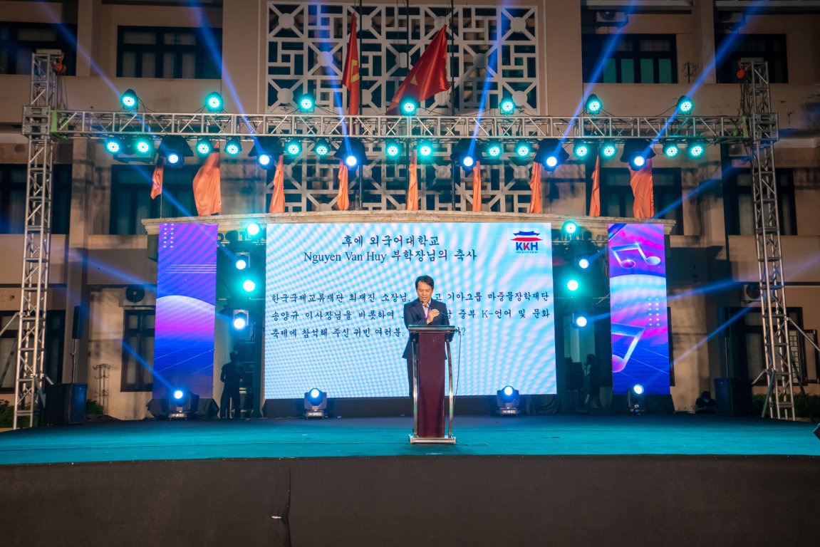 TS. Nguyễn Văn Huy, PHT Trường Đại học Ngoại ngữ, Đại học Huế phát biểu khai mạc cuộc thi hát và nhảy KPOP