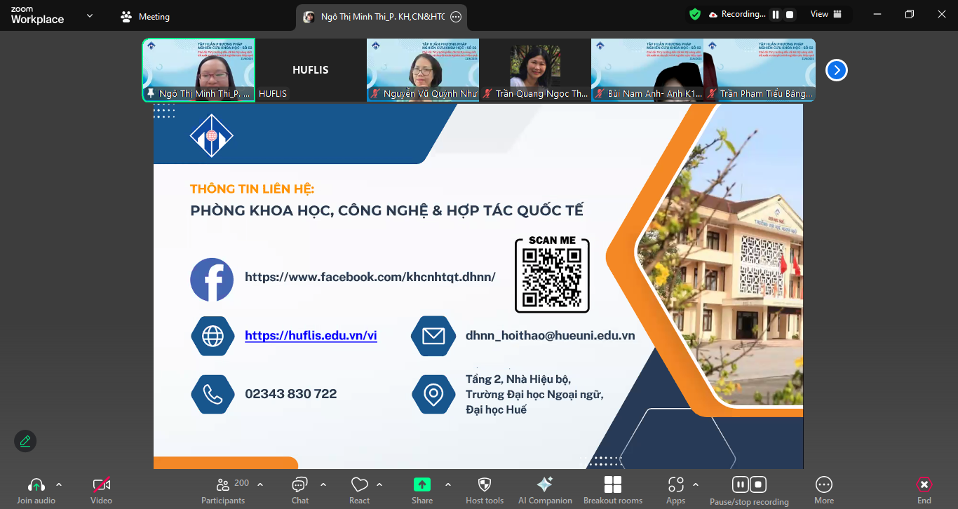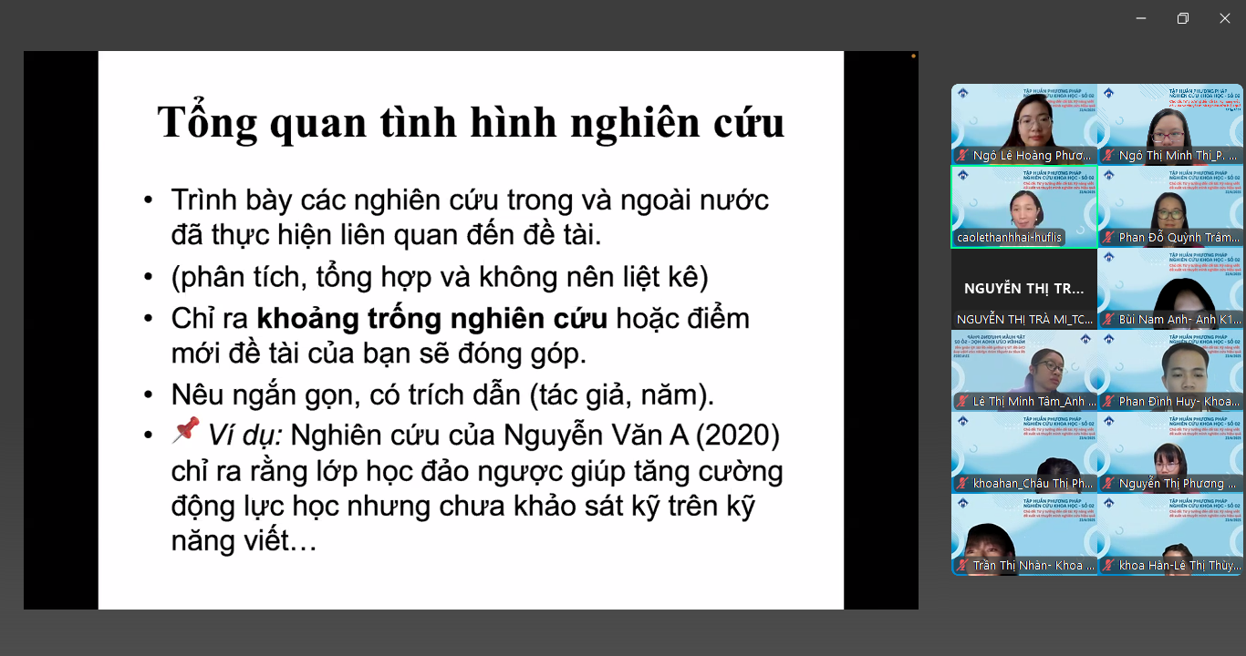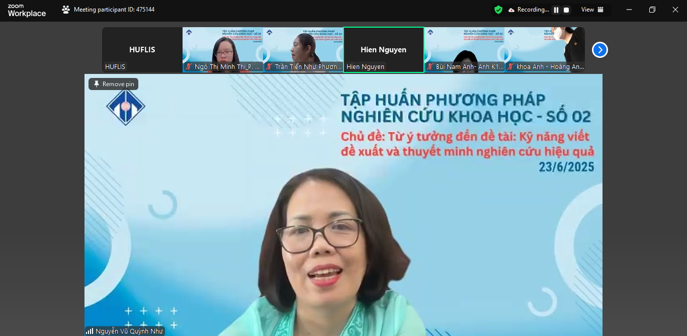 HUFLIS - Vào ngày 23/6/2025, Trường Đại học Ngoại ngữ, Đại học Huế đã tổ chức thành công buổi Tập huấn phương pháp nghiên cứu khoa học (số 02) với chủ đề: “Từ ý tưởng đến đề tài: Kỹ năng viết đề xuất và thuyết minh nghiên cứu hiệu quả” dành cho cán bộ - giảng viên, học viên sau đại học và sinh viên.