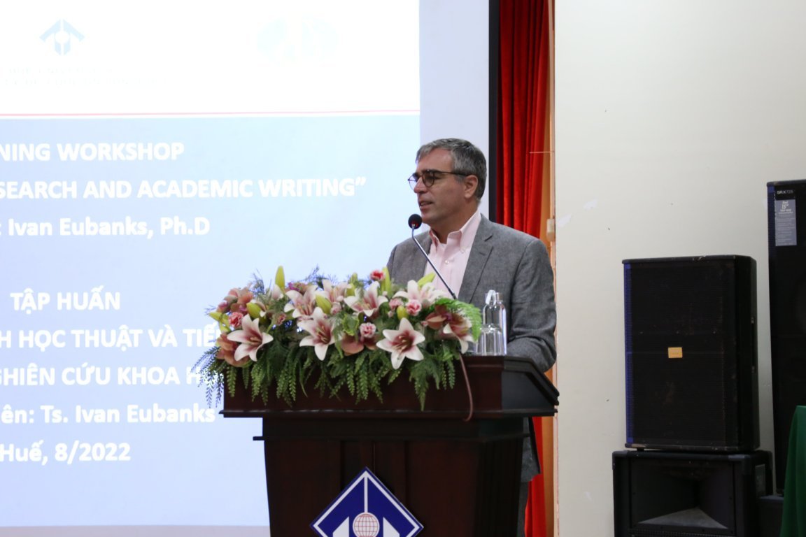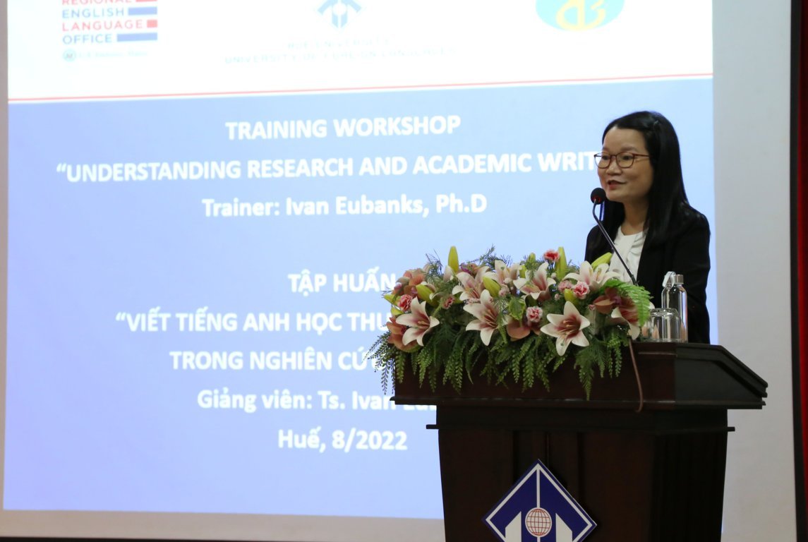 HUFL- Sáng ngày 8/8/2022 Trường Đại học Ngoại ngữ, Đại học Huế phối hợp với Văn phòng tiếng Anh Khu vực thuộc Đại sứ quán Hoa Kỳ tại Việt Nam (RELO) và Đề án Ngoại ngữ Quốc gia, Bộ Giáo dục & Đào tạo Việt Nam đã tổ chức chương trình tập huấn nâng cao kỹ năng viết tiếng Anh với chủ đề “Viết tiếng Anh học thuật và tiếng Anh trong nghiên cứu khoa học” do Tiến sĩ Ivan Eubanks báo cáo.