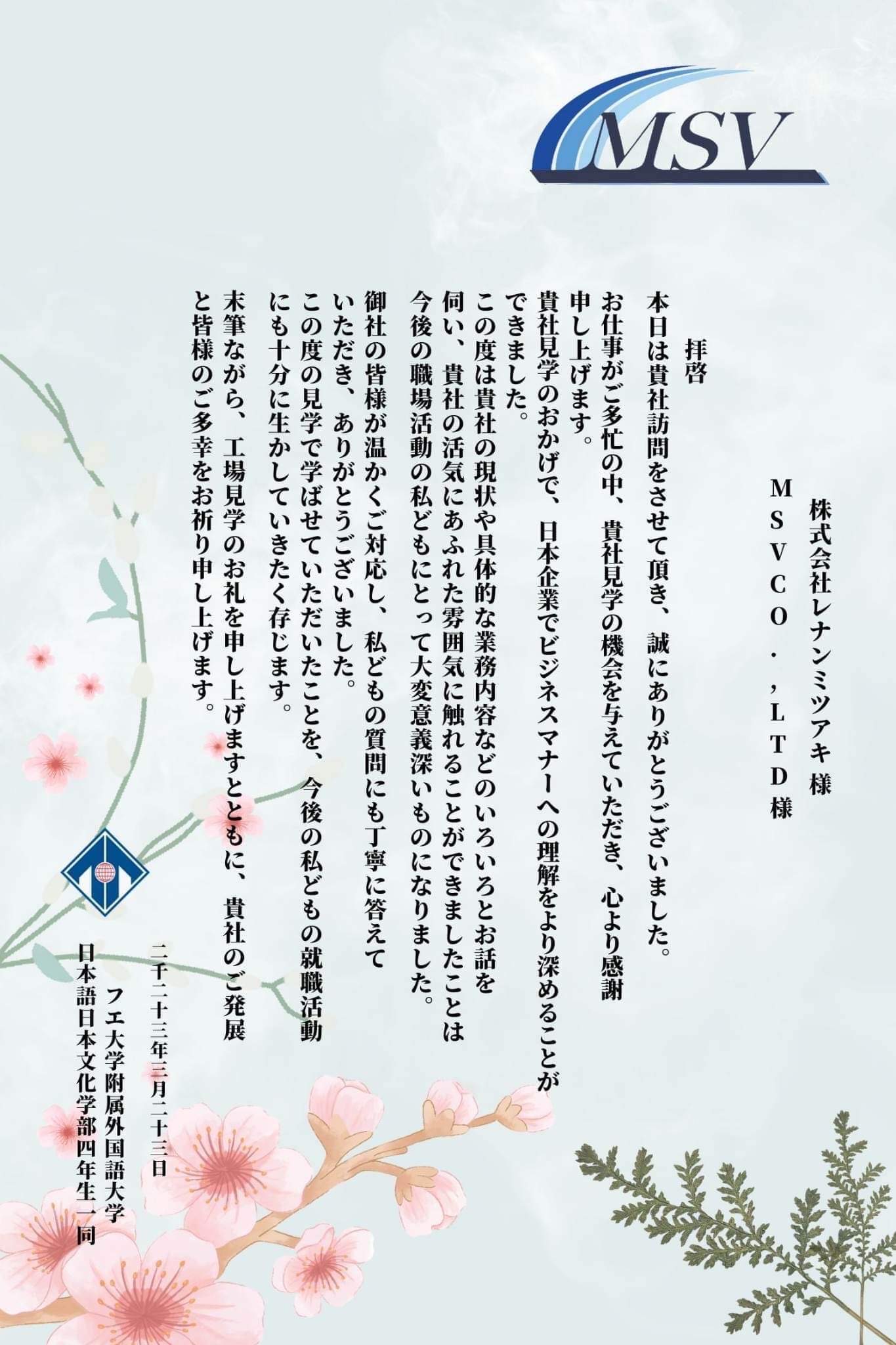 (Thư cảm ơn do chính tay sinh viên Khoa NN&VH Nhật Bản viết gửi đến Công ty TNHH MSV)