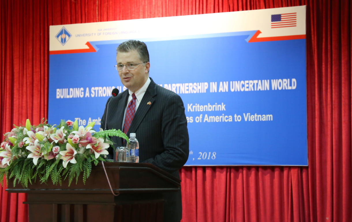 Trong chuyến thăm và làm việc tại Huế, ngày (11/12) Ngài Daniel J. Kritenbrink, đại sứ Hoa Kỳ tại Việt Nam cùng đoàn đến thăm Trường Đại học Ngoại ngữ, Đại học Huế. Tiếp đoàn có TS. Bảo Khâm, Bí thư Đảng uỷ, Hiệu trưởng cùng đại diện lãnh đạo các đơn vị trong Trường.