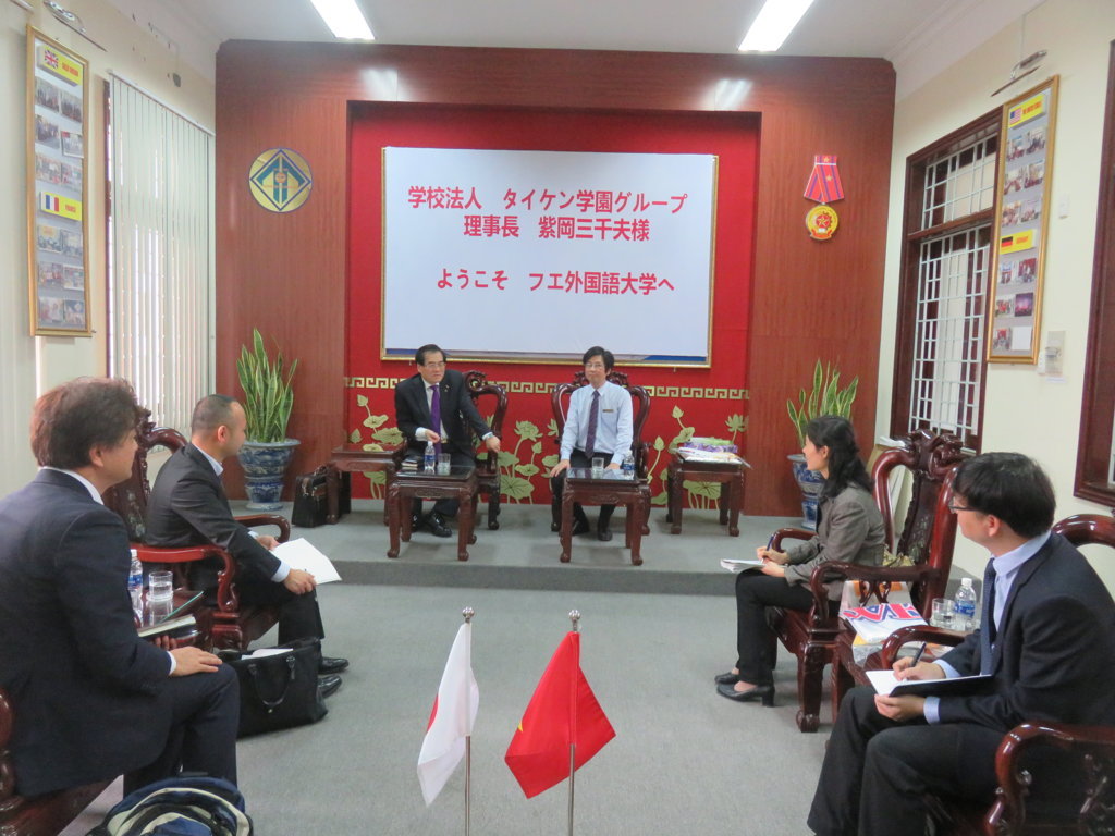 Trong buổi làm việc, Hiệu trưởng Bảo Khâm đã giới thiệu về quy mô đào tạo của trường, khẳng định Trường ĐH Ngoại ngữ, Đại học Huế là một đơn vị đào tạo ngoại ngữ uy tín tại Việt Nam. Chủ tịch học viện Taiken bày tỏ mong muốn hợp tác với Nhà trường trong việc tuyển các sinh viên ưu tú sang học tập và giới thiệu làm việc tại Nhật Bản. Hai bên cũng hướng đến việc mở Trung tâm Văn hóa và Ngôn ngữ Nhật Bản tại Trường ĐH Ngoại ngữ, Đại học Huế trong thời gian sớm nhất.