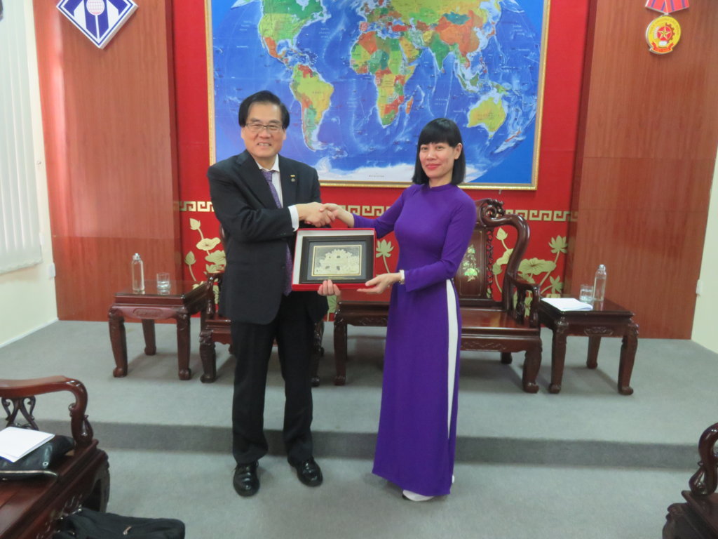 Tham gia tiếp đoàn có PGS. TS Phạm Thị Hồng Nhung-Hiệu trưởng, TS Bảo Khâm-Nguyên Hiệu trưởng, TS Nguyễn Thị Hương Trà-Trưởng Khoa NN & VH Nhật Bản và đại diện lãnh đạo Phòng KH,CN & HTQT. Về phía Học viện có Ông Michio Shibaoka-Chủ tịch học viện Taiken và 2 đại diện của học viện, Ông Yasuhiro Tanaka và Ông Nguyễn Thành Trung.