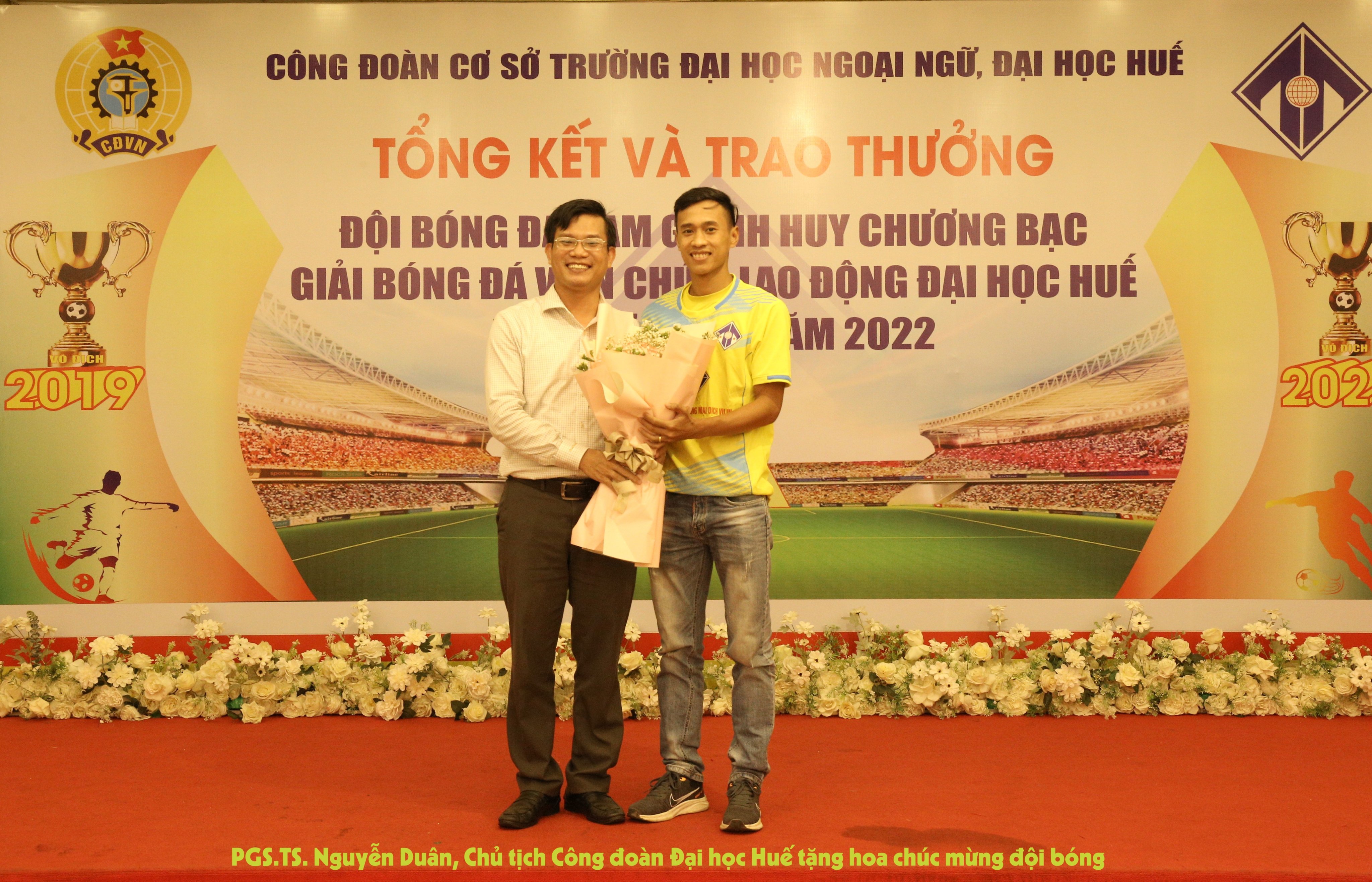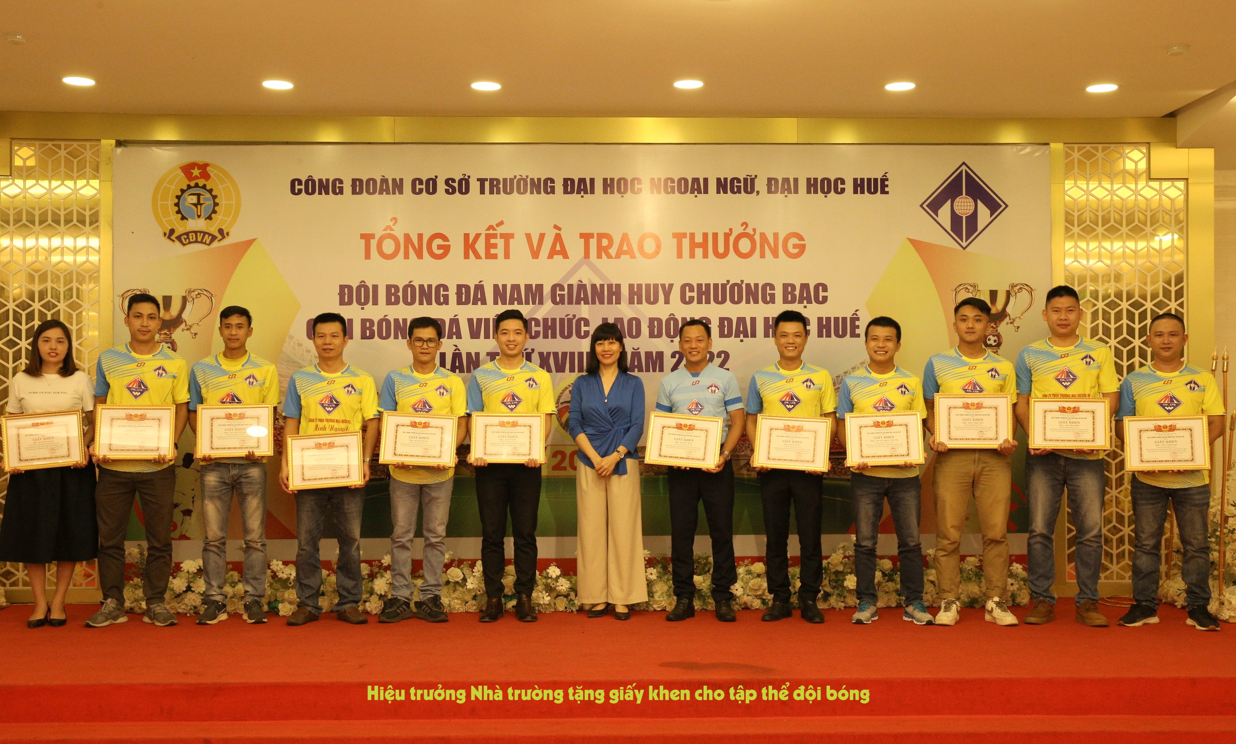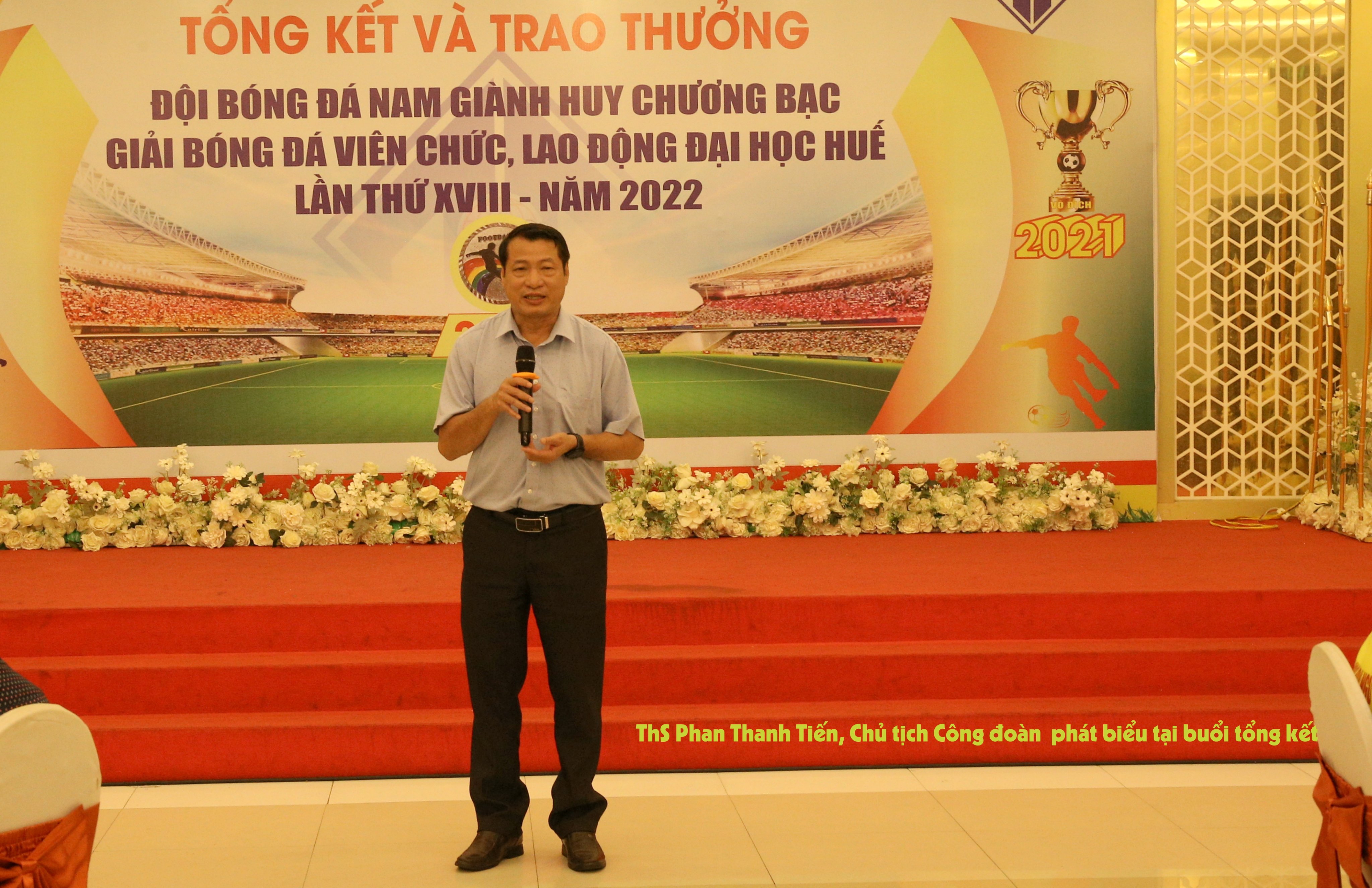 ThS Phan Thanh Tiến, Chủ tịch Công đoàn thay mặt cho tập thể đội bóng gửi lời cảm ơn tới Công đoàn Đại học Huế; lãnh đạo Nhà trường, đặc biệt là Cô Hiệu trưởng đã tạo điều kiện tốt nhất về tinh thần và vật chất, luôn luôn là cổ động viên có mặt tất cả các trận đấu, là nguồn cổ vũ, động viên cho các cầu thủ, là cầu nối cho sự đoàn kết của một tập thể vì ngôi nhà chung và hình ảnh thương hiệu của Trường Đại học Ngoại ngữ, Đại học Huế; cảm ơn sự đồng hành về tinh thần và vật chất của các nhà tài trợ, các mạnh thường quân, các cổ động viên và tập thể đội bóng, chúc mừng đội bóng đã hoàn thành tốt nhiệm vụ và mang lại thành công của mùa giải.