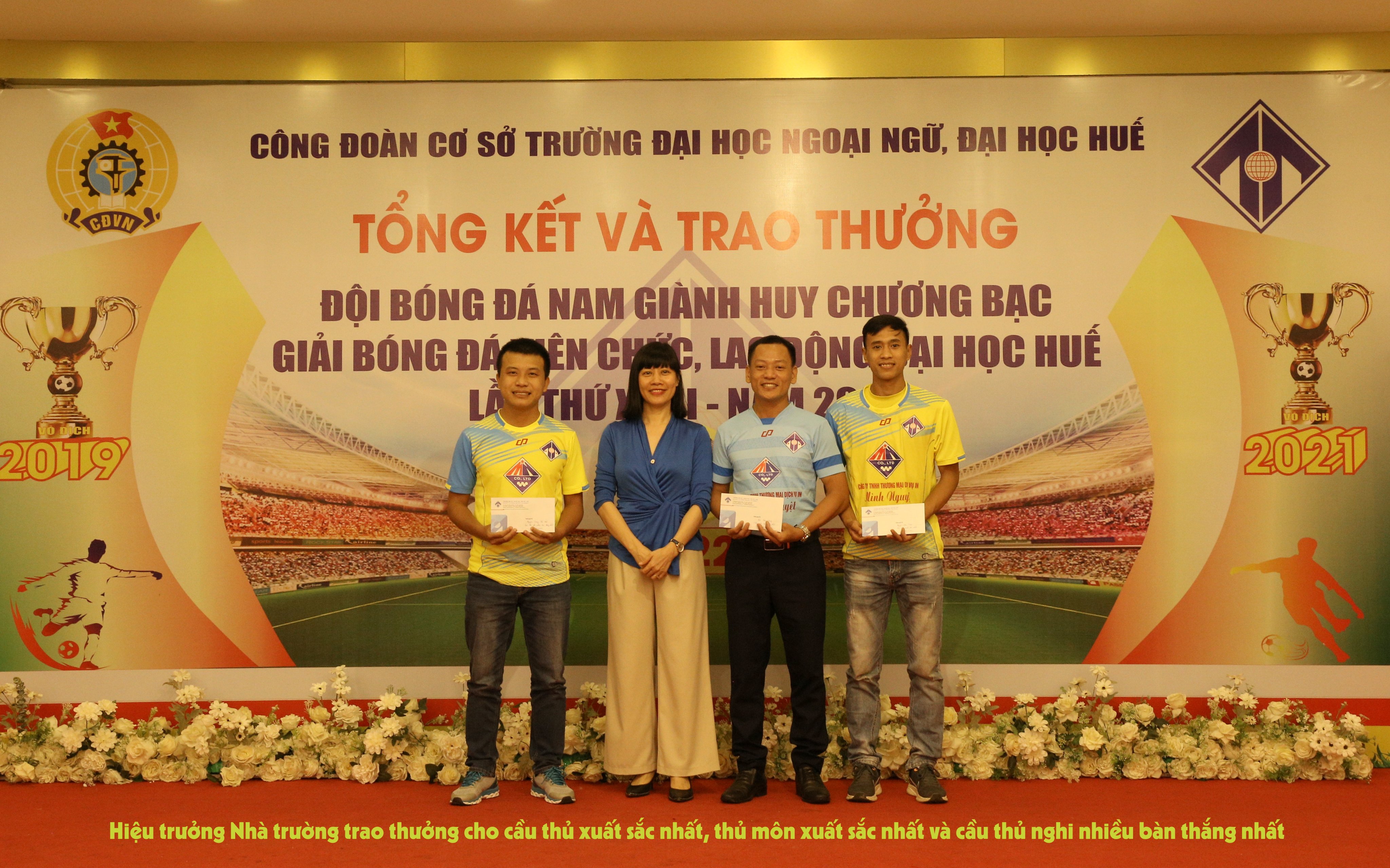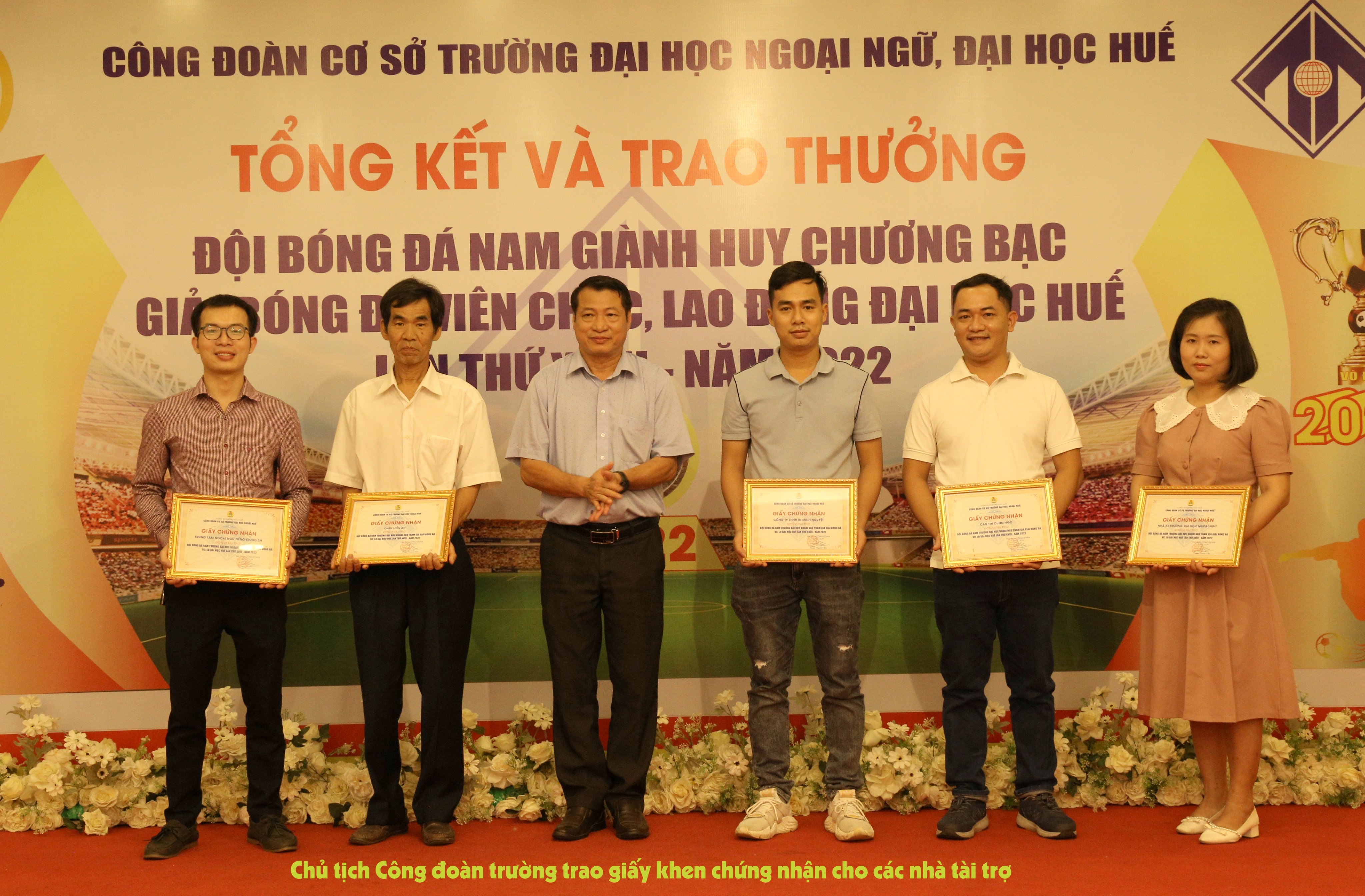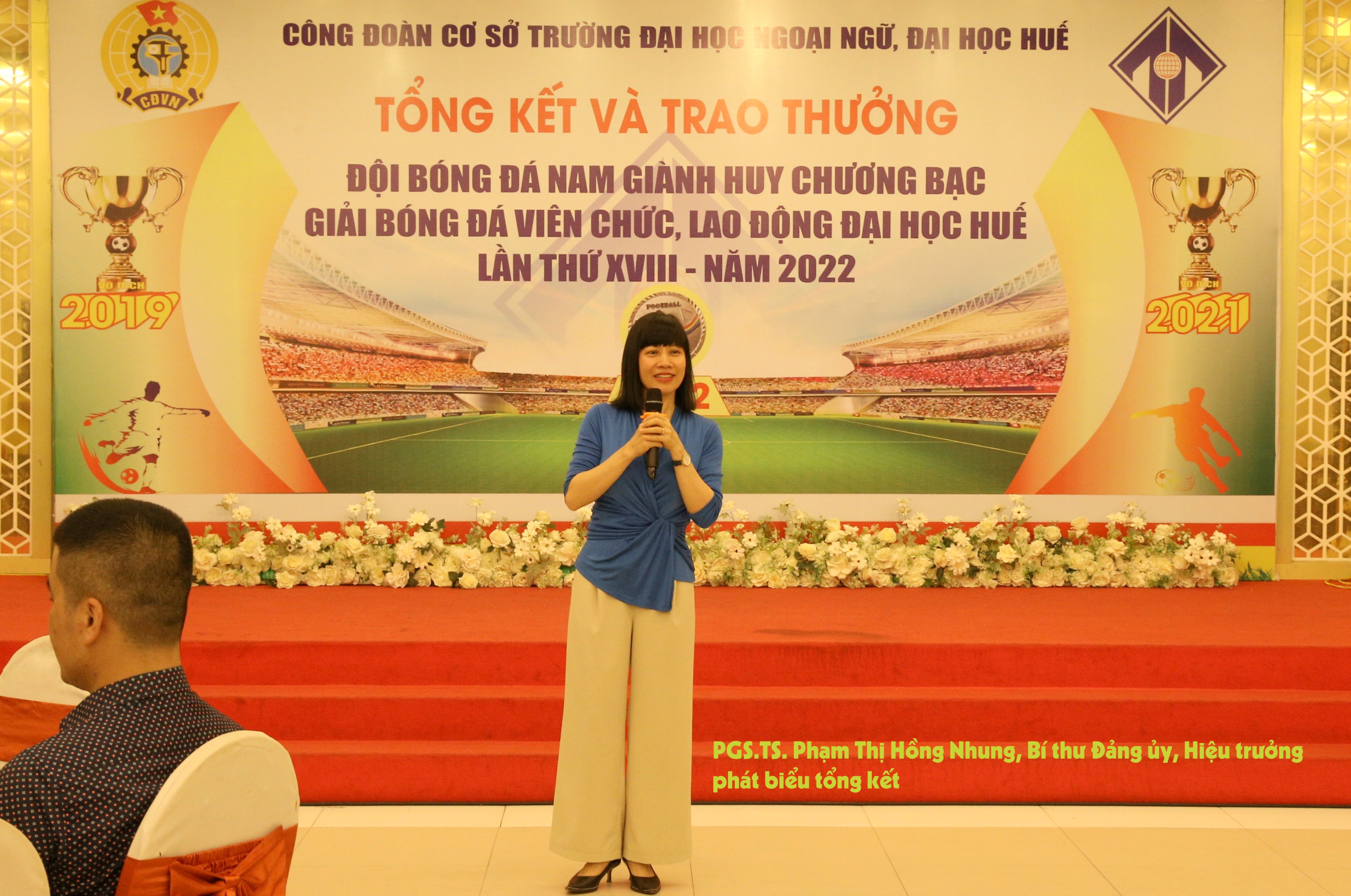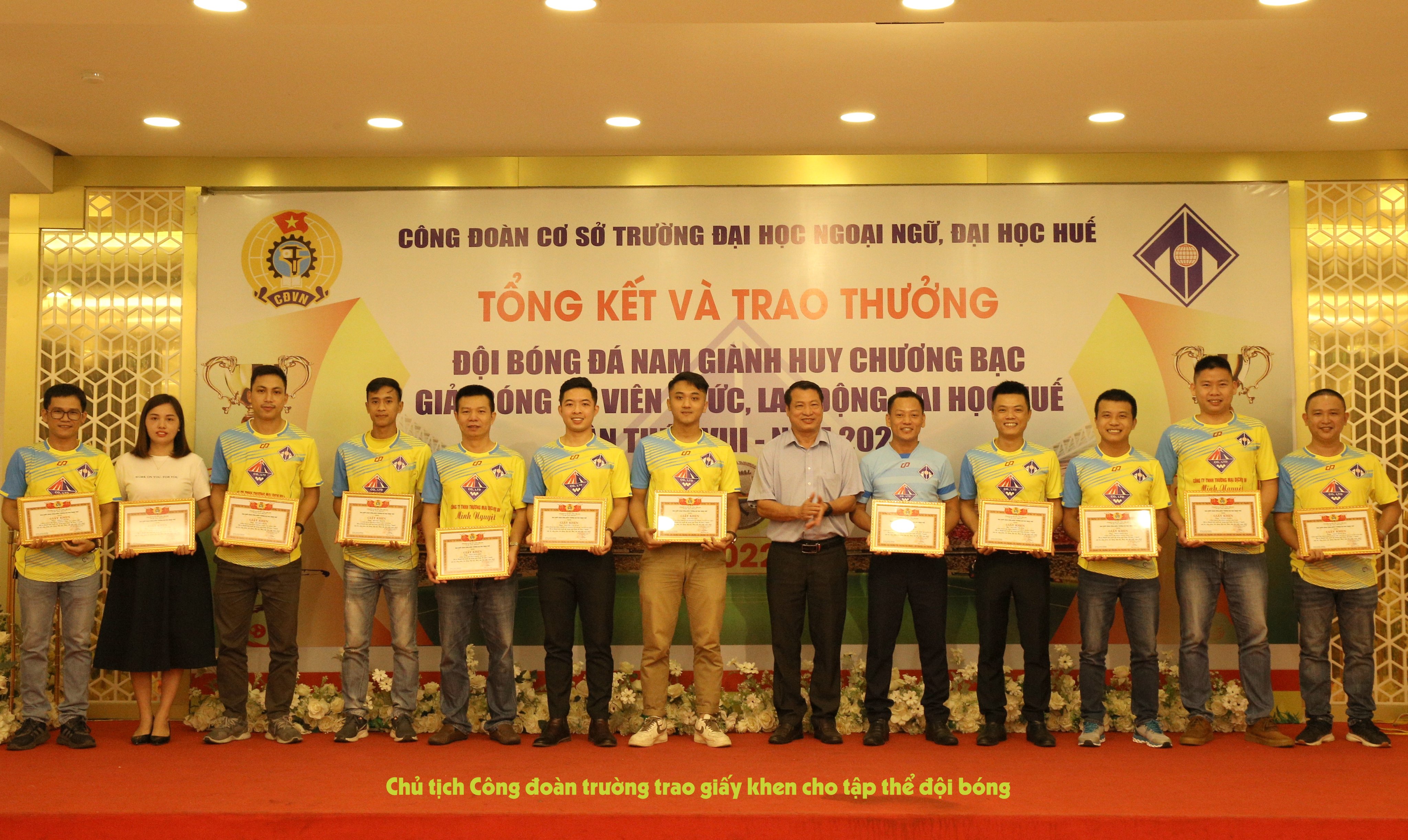 ThS Phan Thanh Tiến, Chủ tịch Công đoàn thay mặt cho tập thể đội bóng gửi lời cảm ơn tới Công đoàn Đại học Huế; lãnh đạo Nhà trường, đặc biệt là Cô Hiệu trưởng đã tạo điều kiện tốt nhất về tinh thần và vật chất, luôn luôn là cổ động viên có mặt tất cả các trận đấu, là nguồn cổ vũ, động viên cho các cầu thủ, là cầu nối cho sự đoàn kết của một tập thể vì ngôi nhà chung và hình ảnh thương hiệu của Trường Đại học Ngoại ngữ, Đại học Huế; cảm ơn sự đồng hành về tinh thần và vật chất của các nhà tài trợ, các mạnh thường quân, các cổ động viên và tập thể đội bóng, chúc mừng đội bóng đã hoàn thành tốt nhiệm vụ và mang lại thành công của mùa giải.