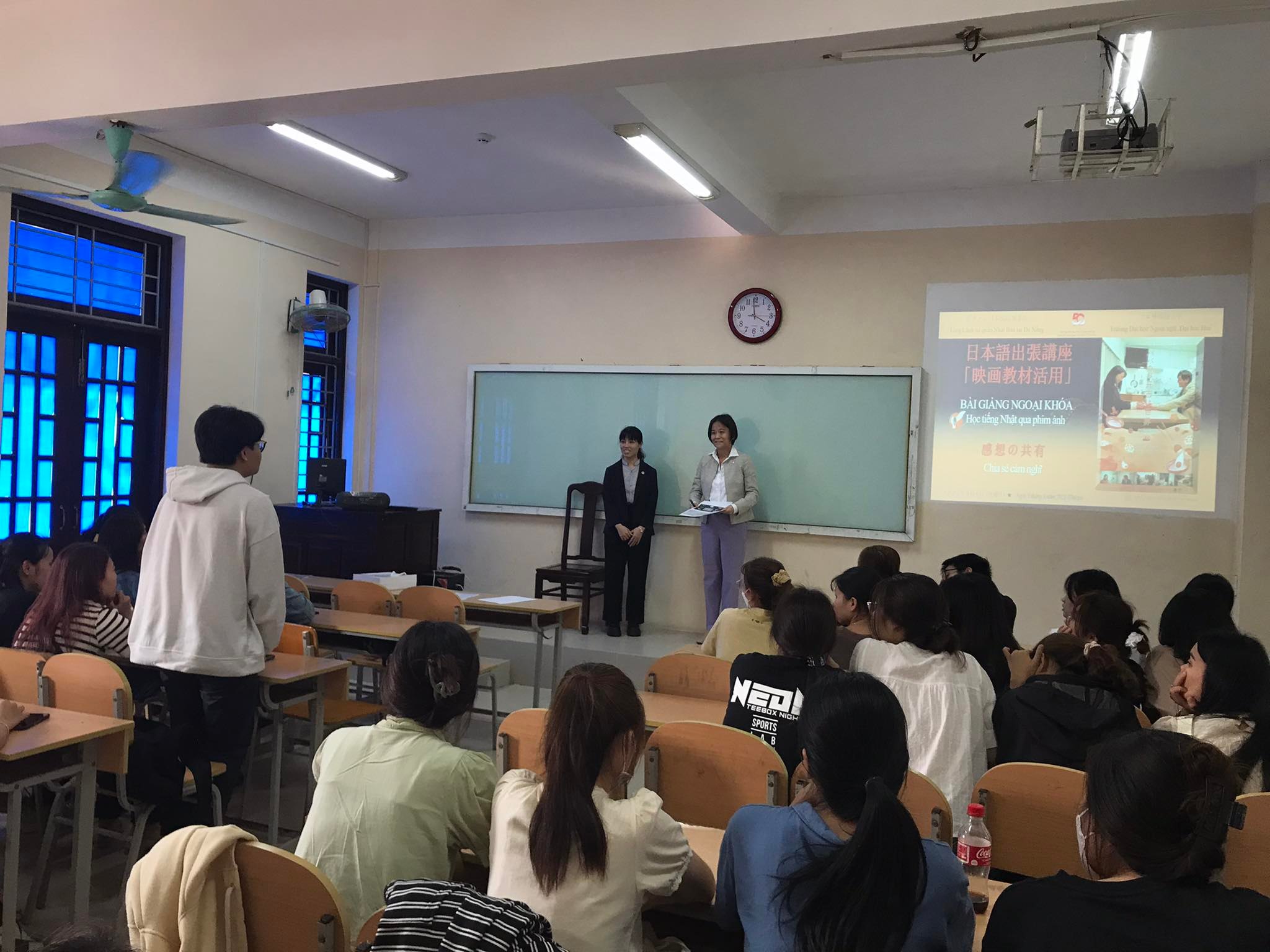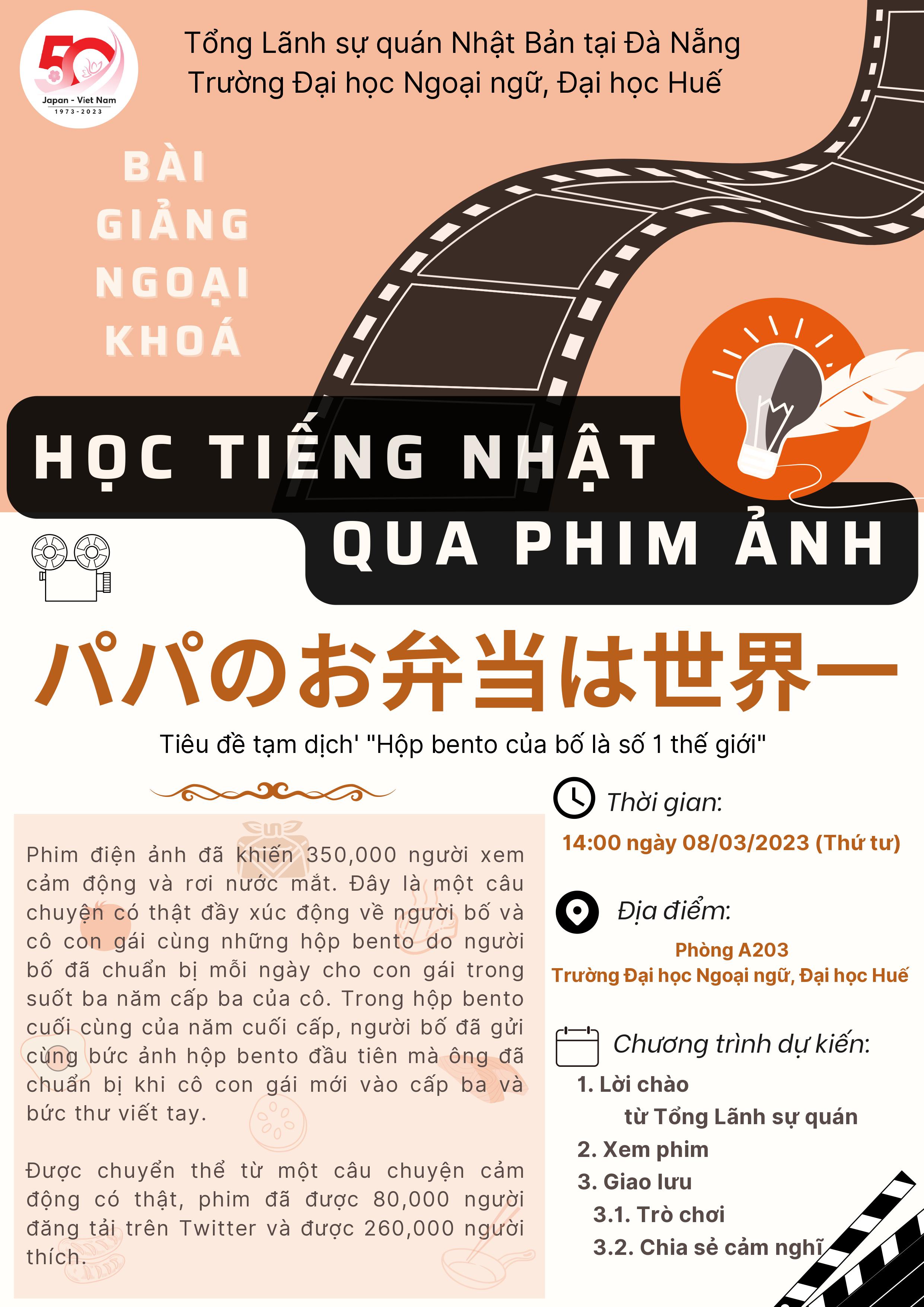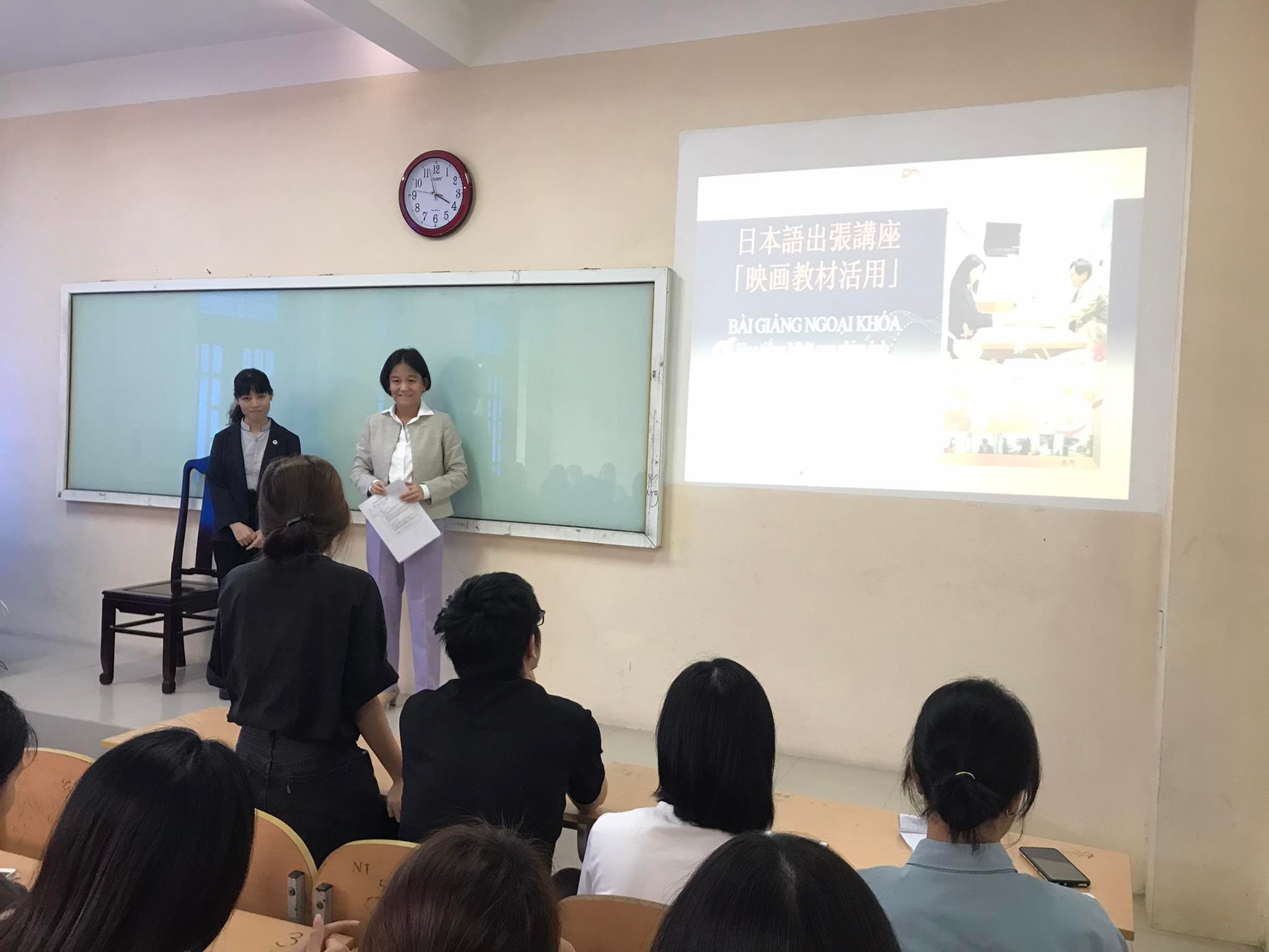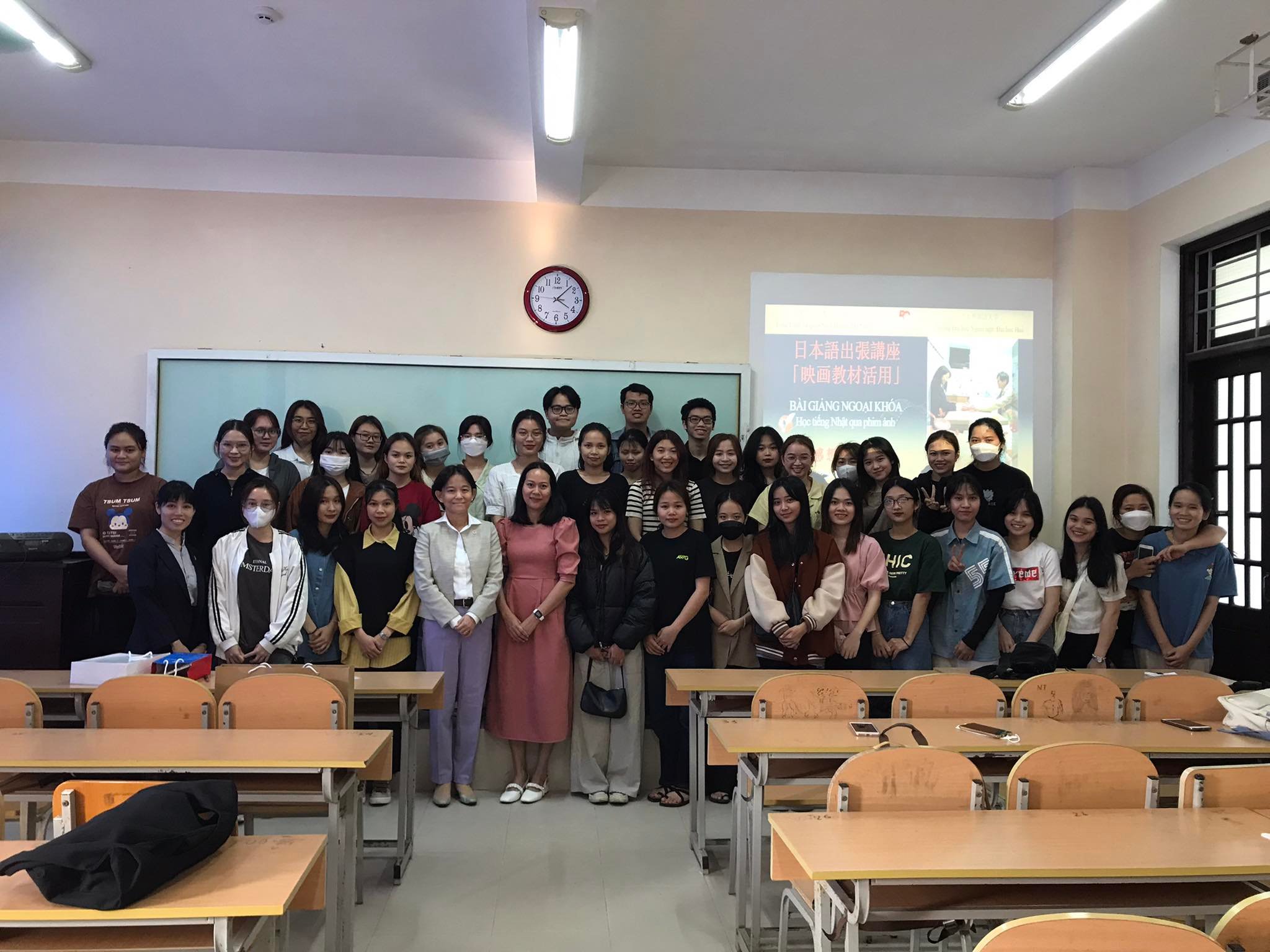 Nhân dịp kỷ niệm 50 năm thiết lập quan hệ ngoại giao Nhật Bản – Việt Nam, Tổng Lãnh sự Nhật Bản tại Đà Nẵng phối hợp với Trường Đại học Ngoại ngữ - Đại học Huế đã tổ chức Bài giảng ngoại khóa với nội dung “Học tiếng Nhật qua phim ảnh”. Hoạt động đã diễn ra vào chiều ngày 08/03 vừa qua và thu hút nhiều sinh viên tham gia.