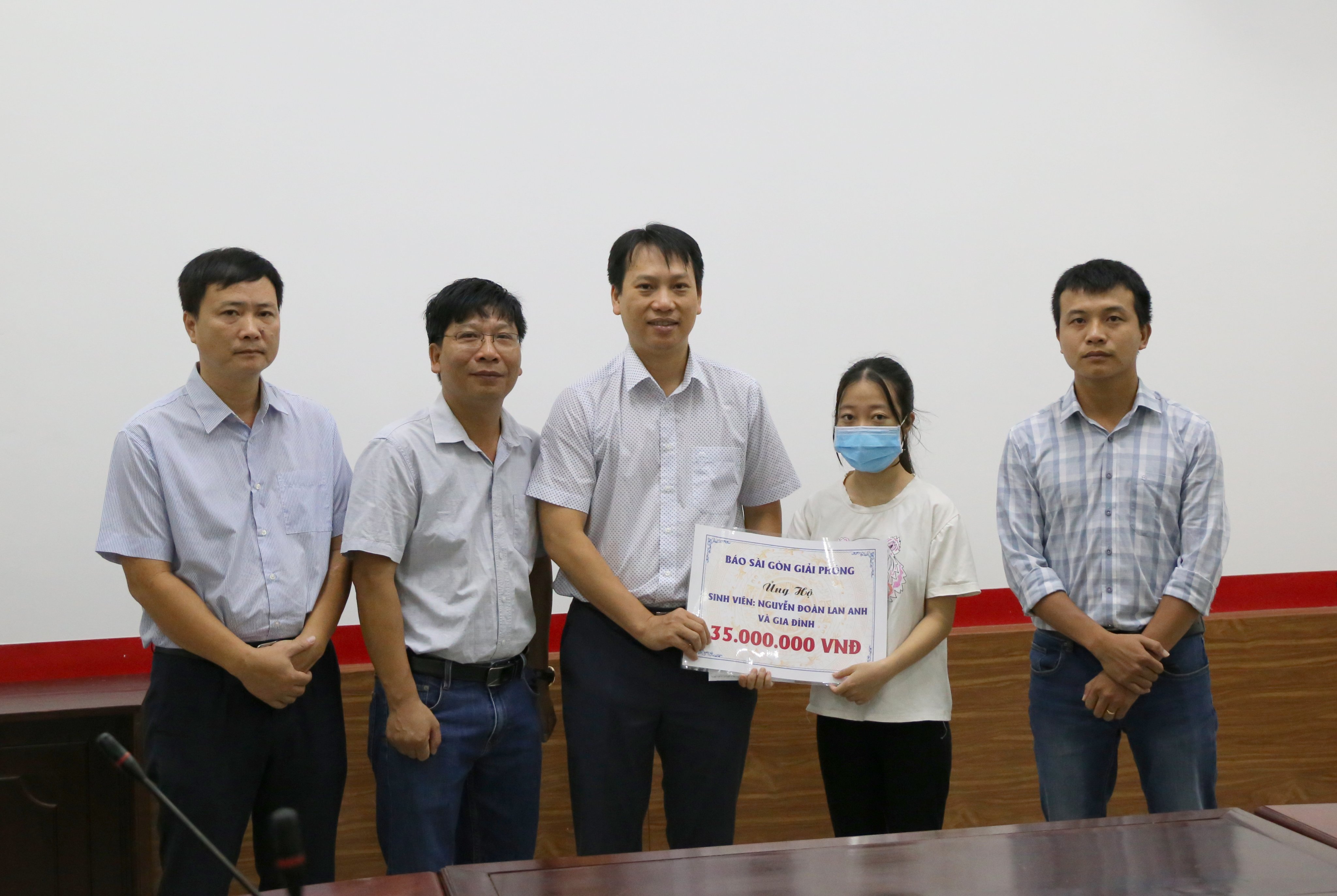 HUFL-Sáng ngày 08/09 nhà báo Vũ Văn Thắng (phóng viên thường trú Báo Sài Gòn Giải Phóng tại Thừa Thiên Huế) đã thay mặt Báo Sài Gòn Giải Phóng và các nhà hảo tâm đến thăm hỏi, động viên và trao phần quà 35 triệu đồng cho sinh viên Nguyễn Đoàn Lan Anh, lớp Anh K17N, Trường Đại học Ngoại ngữ, Đại học Huế có hoàn cảnh đặc biệt khó khăn nhằm giúp em thêm điều kiện và động lực để được tiếp tục đến trường.