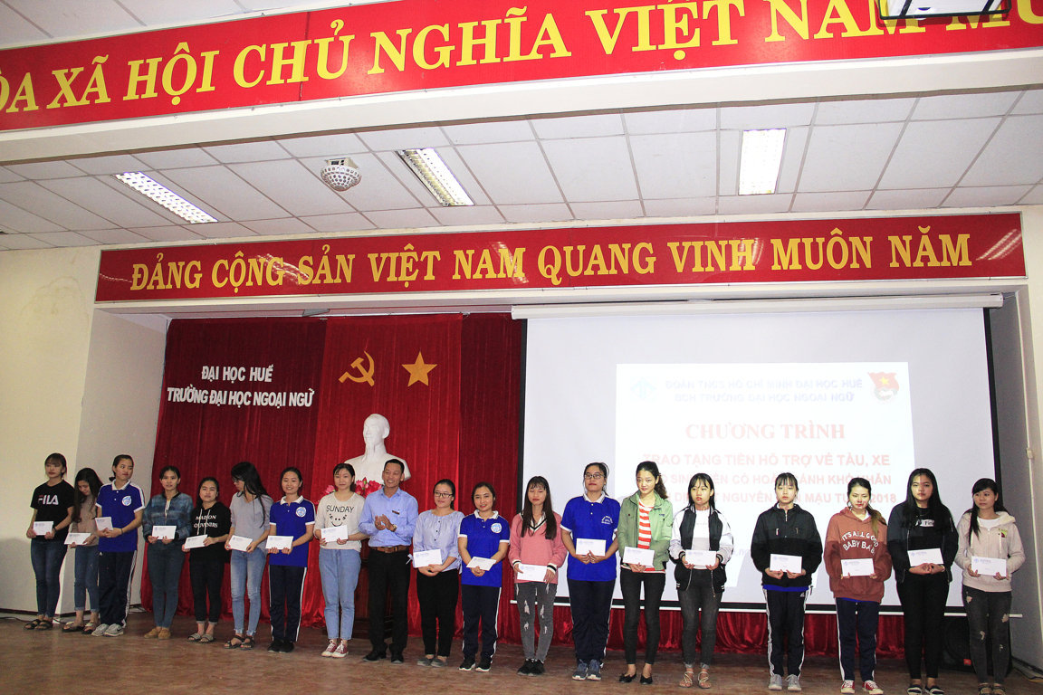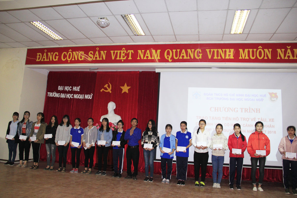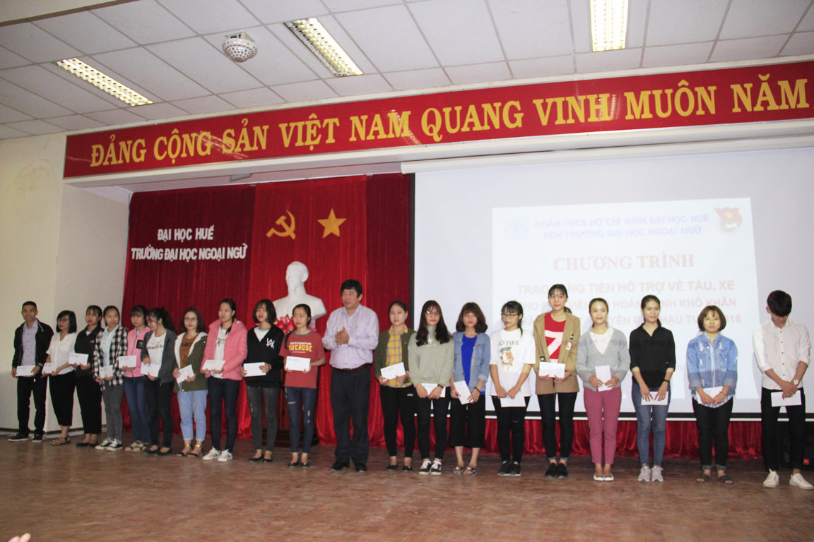 Với tinh thần sẻ chia, tương thân tương ái, tiếp nối truyền thống đạo lý “Lá lành đùm lá rách - thương người như thể thương thân” của dân tộc Việt Nam. Sáng ngày 25 tháng 01 năm 2018 Đoàn Trường Đại học Ngoại ngữ, Đại học Huế đã long trọng tổ chức Chương trình “Trao tặng tiền hỗ trợ vé tàu, xe cho sinh viên có hoàn cảnh khó khăn nhân dịp tết Nguyên đán Mậu Tuất 2018”.