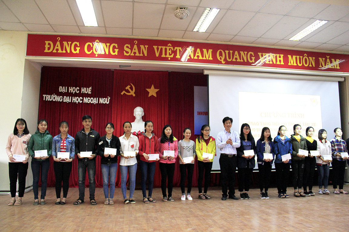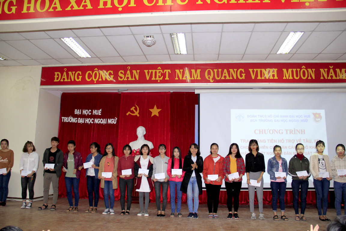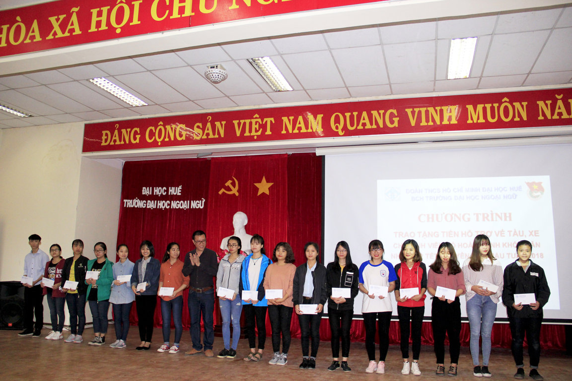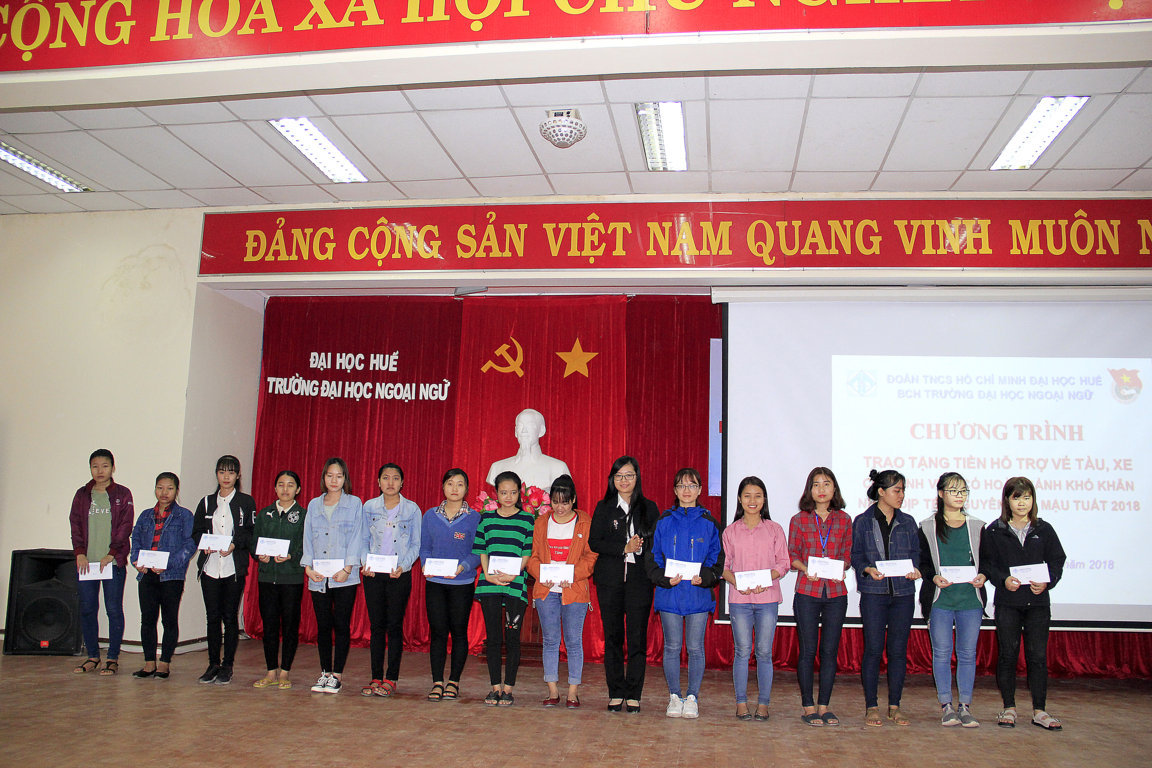 Với tinh thần sẻ chia, tương thân tương ái, tiếp nối truyền thống đạo lý “Lá lành đùm lá rách - thương người như thể thương thân” của dân tộc Việt Nam. Sáng ngày 25 tháng 01 năm 2018 Đoàn Trường Đại học Ngoại ngữ, Đại học Huế đã long trọng tổ chức Chương trình “Trao tặng tiền hỗ trợ vé tàu, xe cho sinh viên có hoàn cảnh khó khăn nhân dịp tết Nguyên đán Mậu Tuất 2018”.
