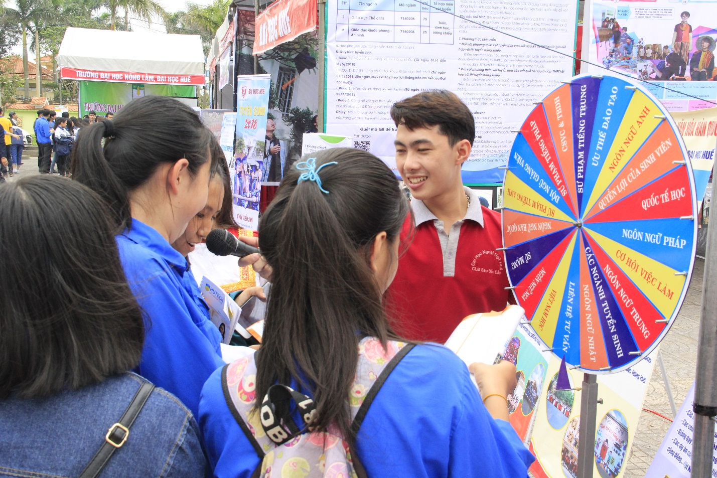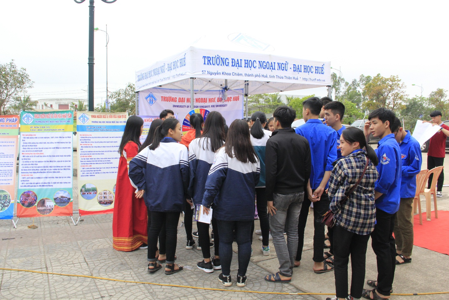 Tại gian hàng của Trường Đại học Ngoại ngữ, Đại học Huế đã tổ chức nhiều trò chơi có thưởng, thu hút đông đảo các bạn học sinh tỉnh Quảng Bình. Tại đây, các bạn học sinh không chỉ được giao lưu với các sinh viên hiện đang học tập tại trường, mà còn nhận được sự tư vấn nhiệt tình, giàu kinh nghiệm từ thầy Phan Thanh Tiến, Phó trưởng Phòng Đào tạo.
